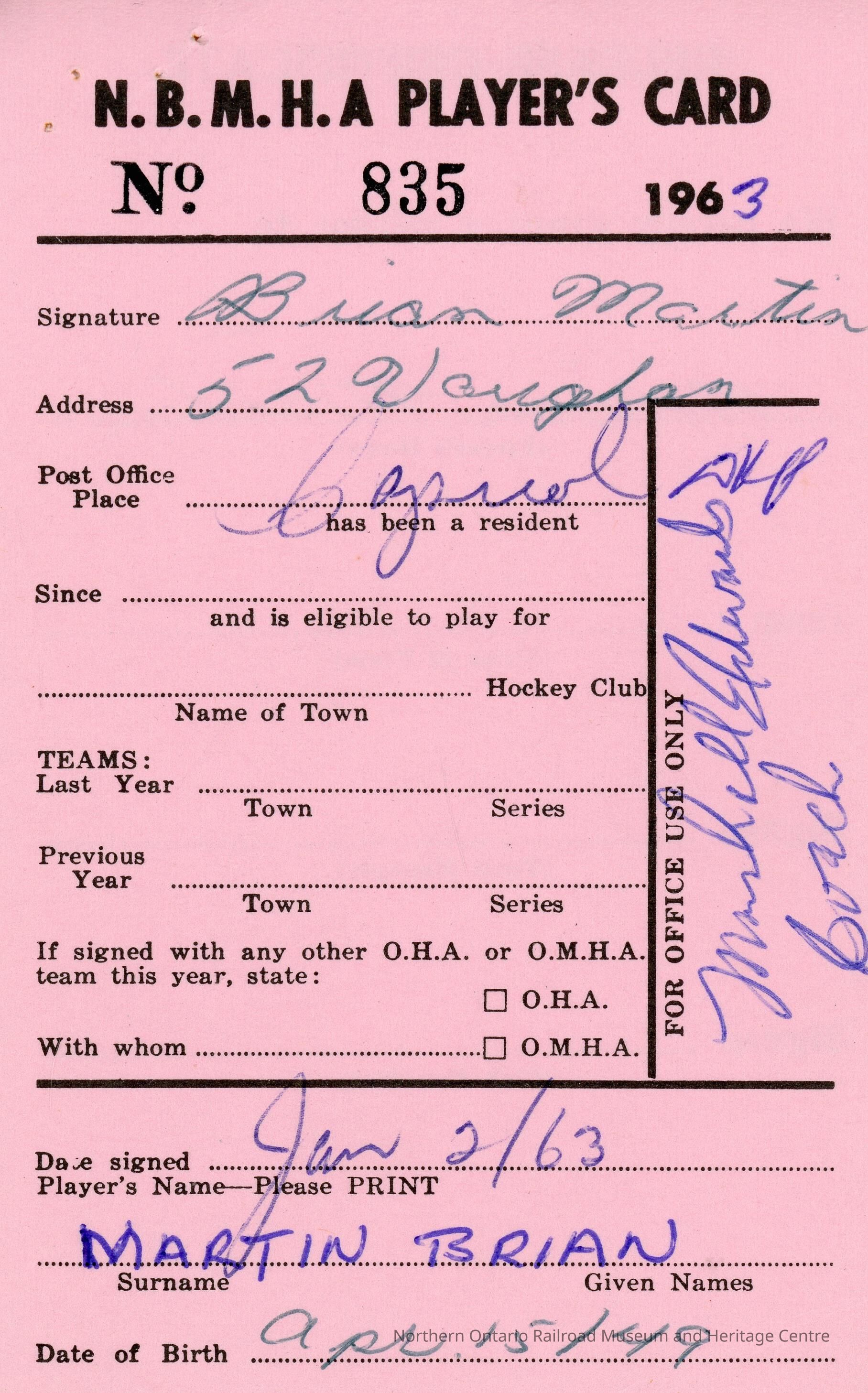 Hockey Player's registration card for the North Bay Minor Hockey Association belonging to Brian MartinCreator