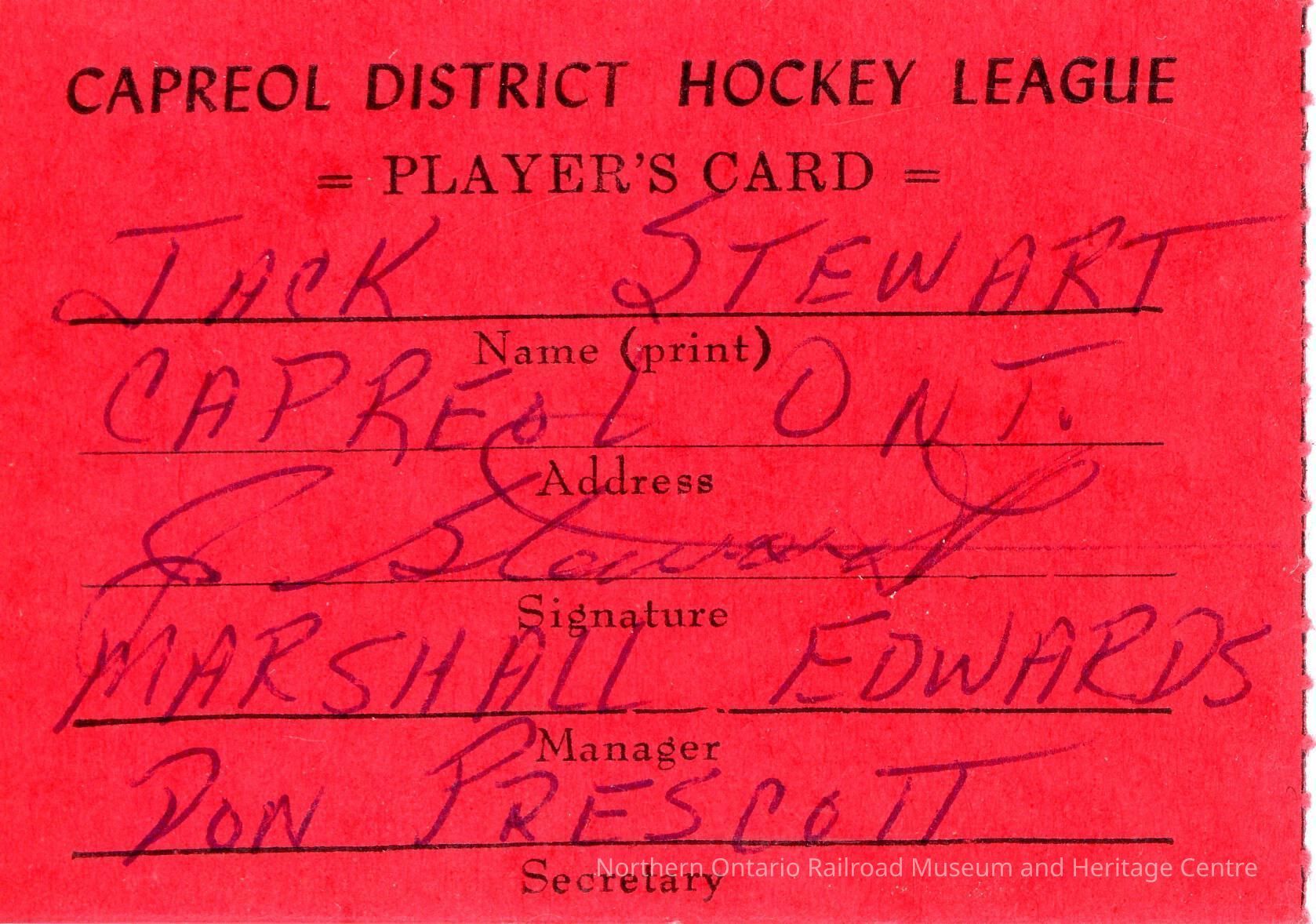 The card was used as an identifier for all players within the Capreol District Hockey LeagueCollection