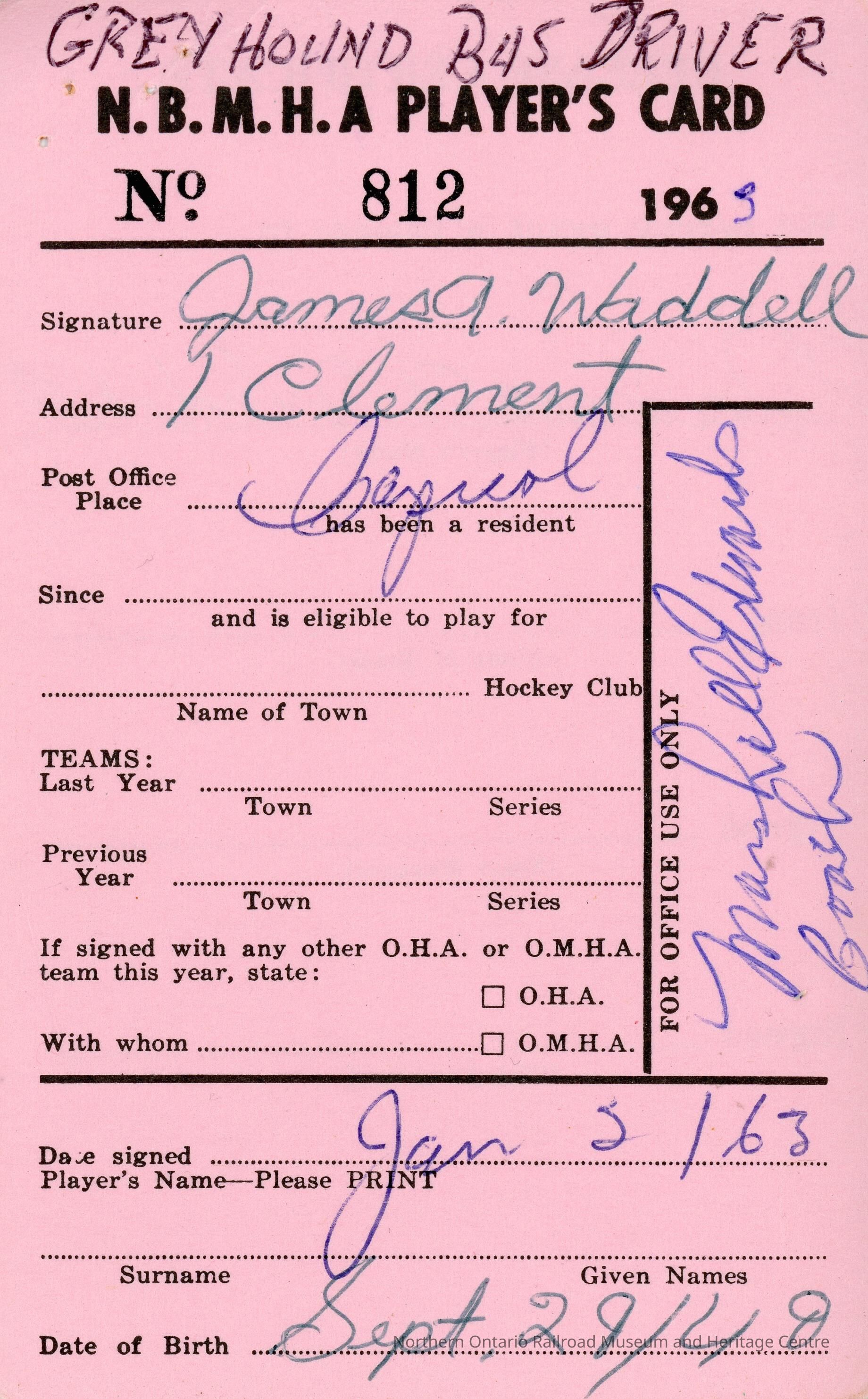 Hockey Player's registration card for the North Bay Minor Hockey Association belonging to James WaddellCreator