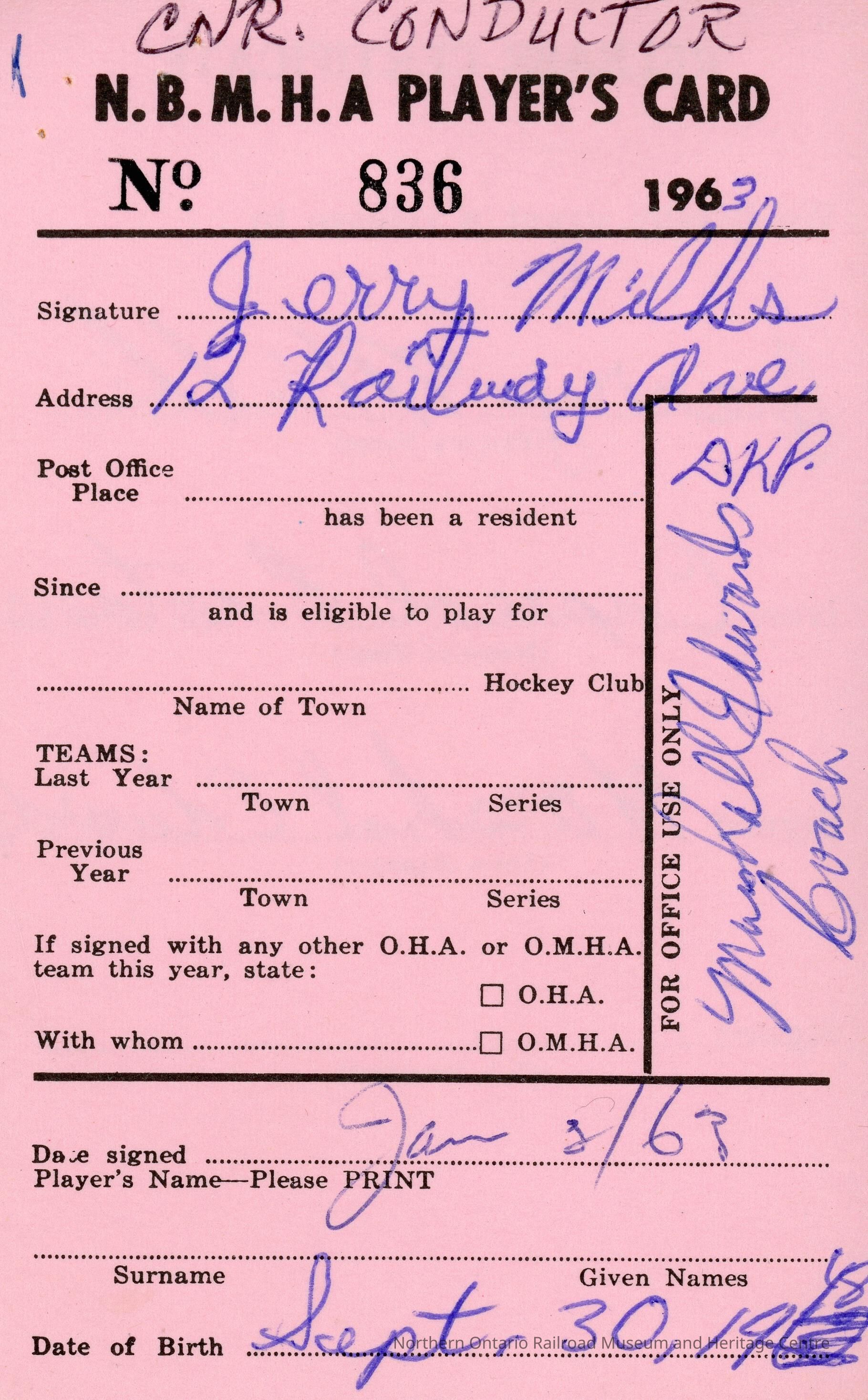 Hockey Player's registration card for the North Bay Minor Hockey Association belonging to Jerry MaahsCreator