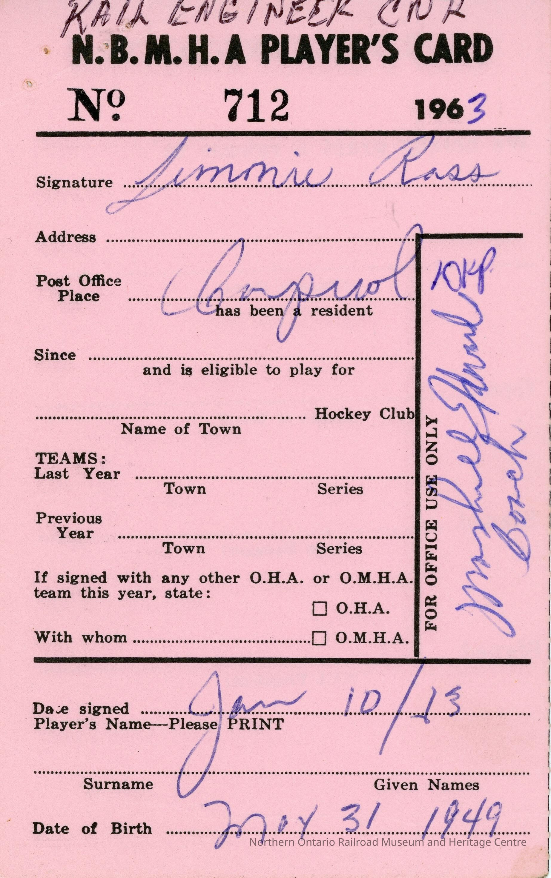 Hockey Player's registration card for the North Bay Minor Hockey Association belonging to Jimmie RossCreator