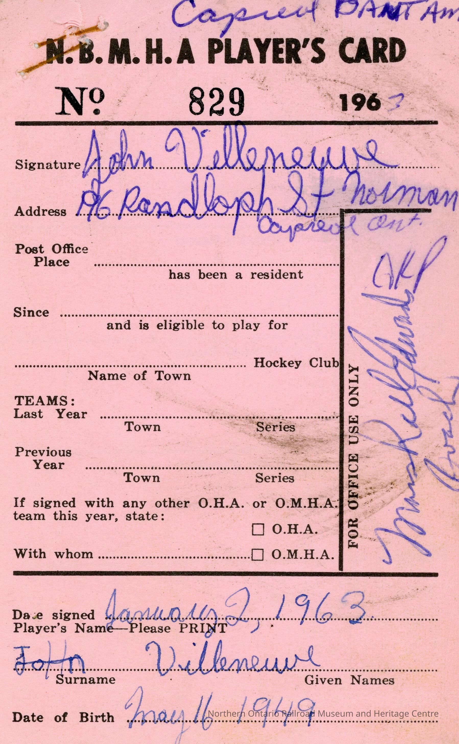 Hockey Player's registration card for the North Bay Minor Hockey Association belonging to John VeilleneuveCreator