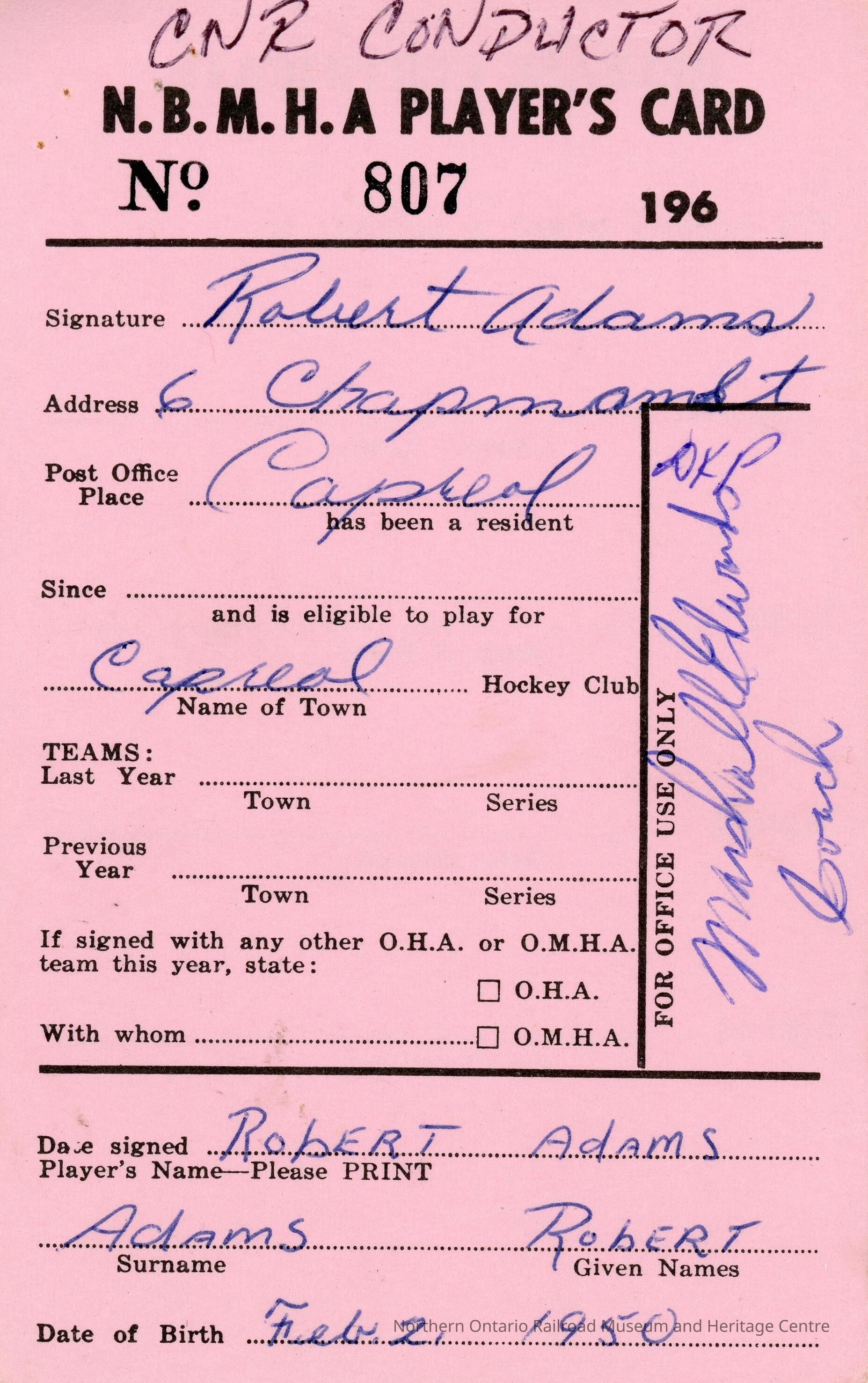 Hockey Player's registration card for the North Bay Minor Hockey Association belonging to Robert AdamsCreator