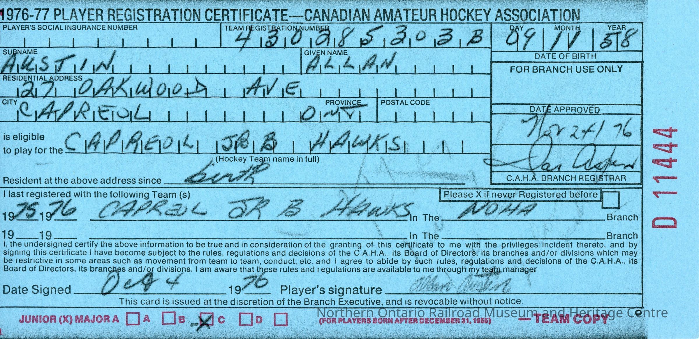 Player registration certificate for the Canadian Amateur Hockey Association belonging to Allan Austin for the 1976-1977 yearContext