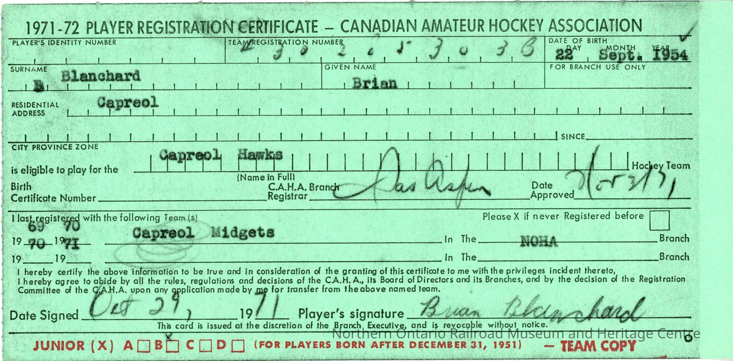 Hockey Player's Registration Certificate belonging to Brian BlanchardEntry/Object ID