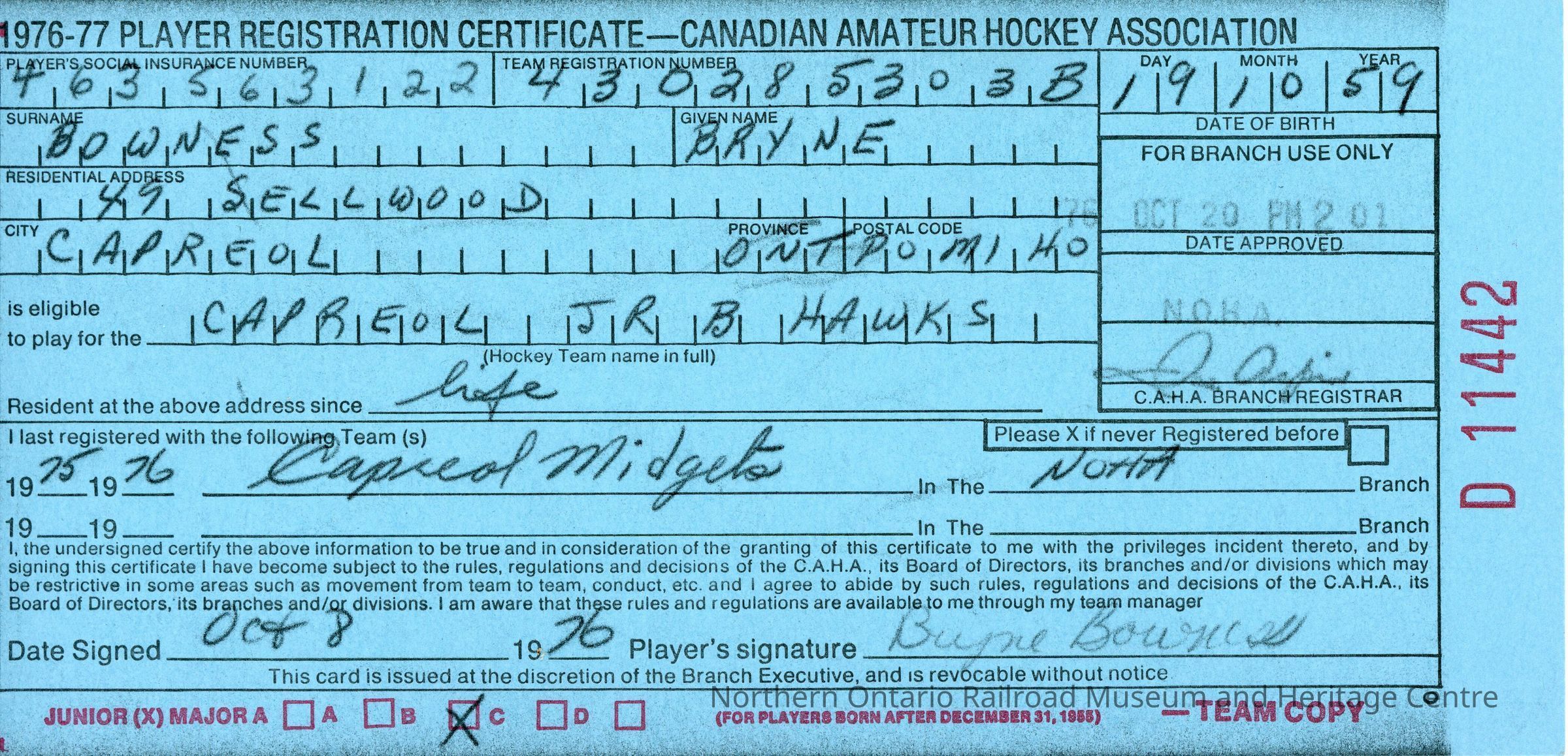 Hockey Player's Registration Certificate belonging to Bryne BownessEntry/Object ID