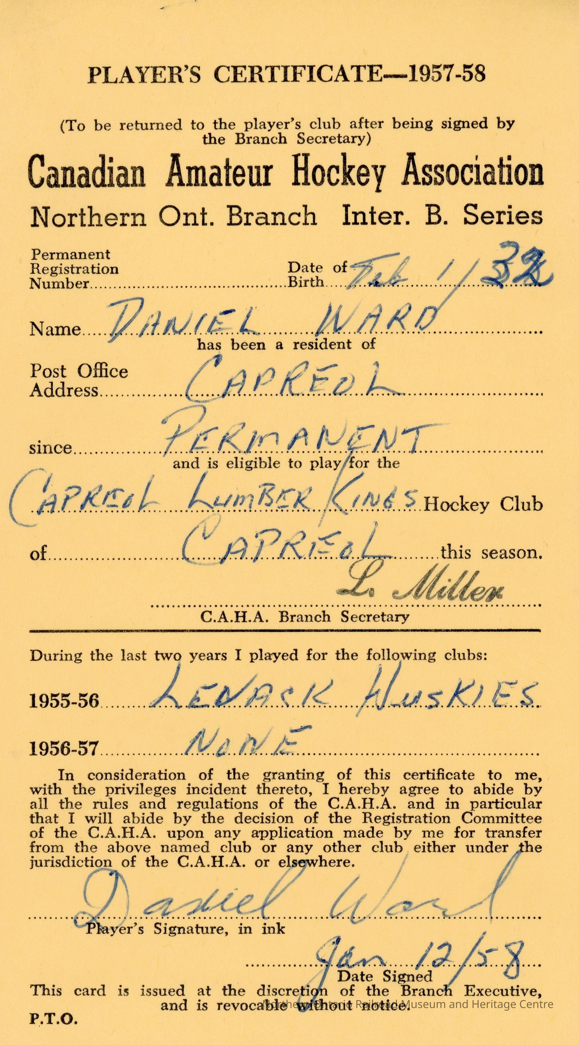 Hockey Player's Registration Certificate belonging to Daniel WardEntry/Object ID