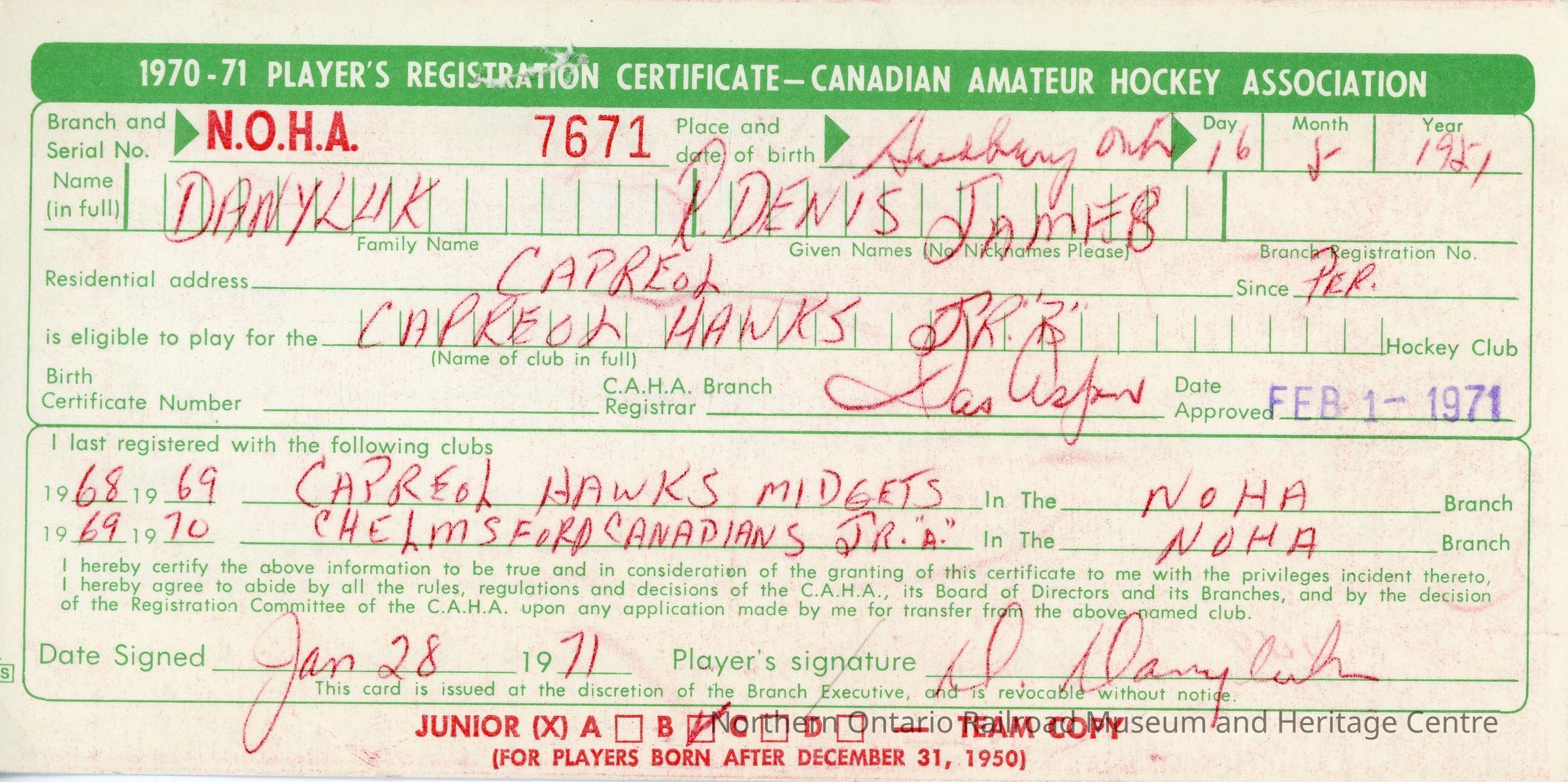 Player registration certificate for the Canadian Amateur Hockey Association belonging to Denis James Danyluk for the 1970-1971 yearContext
