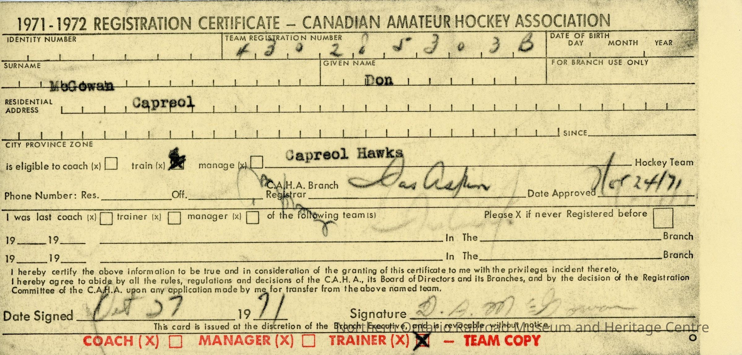 Player registration certificate for the Canadian Amateur Hockey Association belonging to Don McGowan for the 1971-1972 yearContext