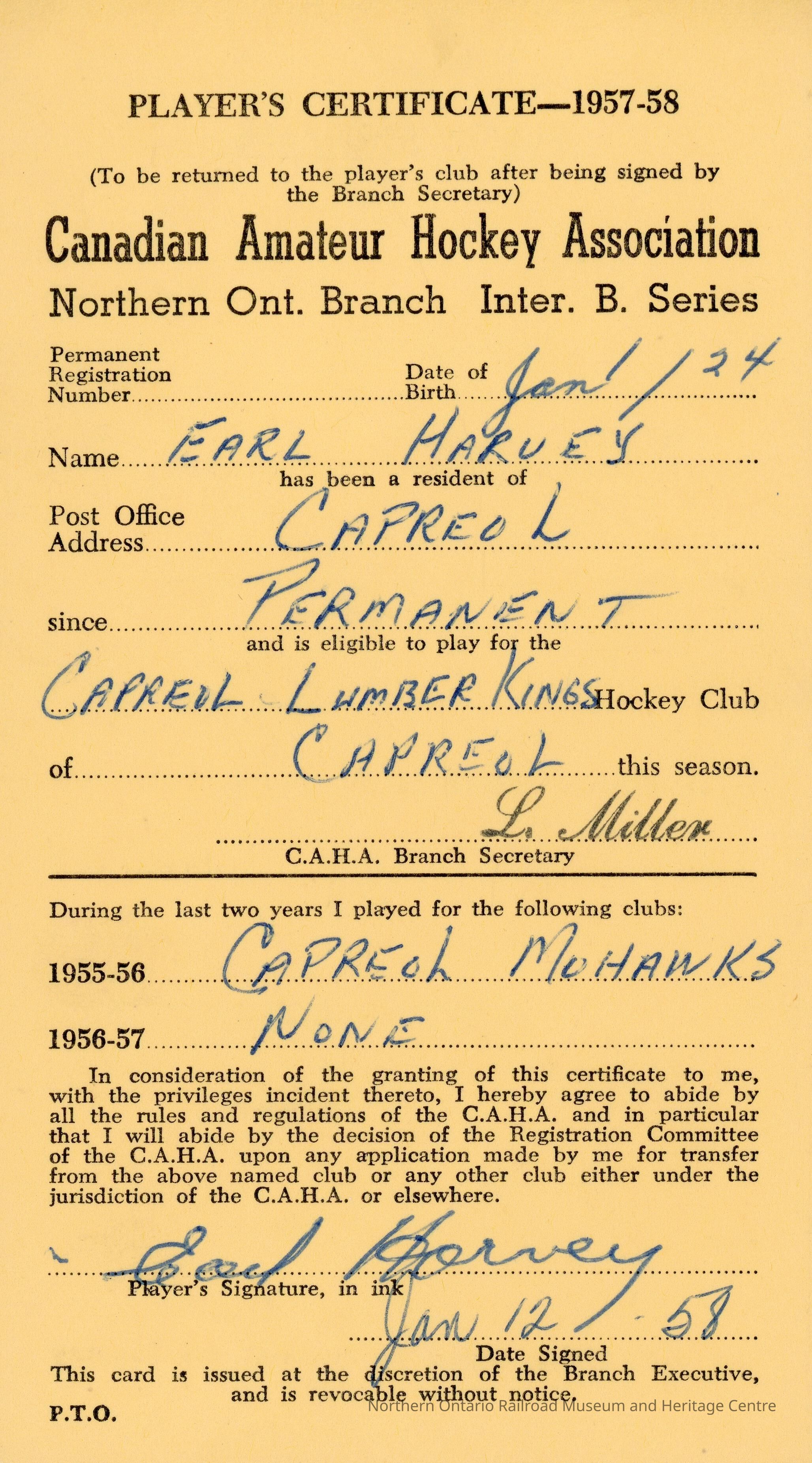 Player registration certificate for the Canadian Amateur Hockey Association belonging to Earl Harvey for the 1957-1958 yearContext
