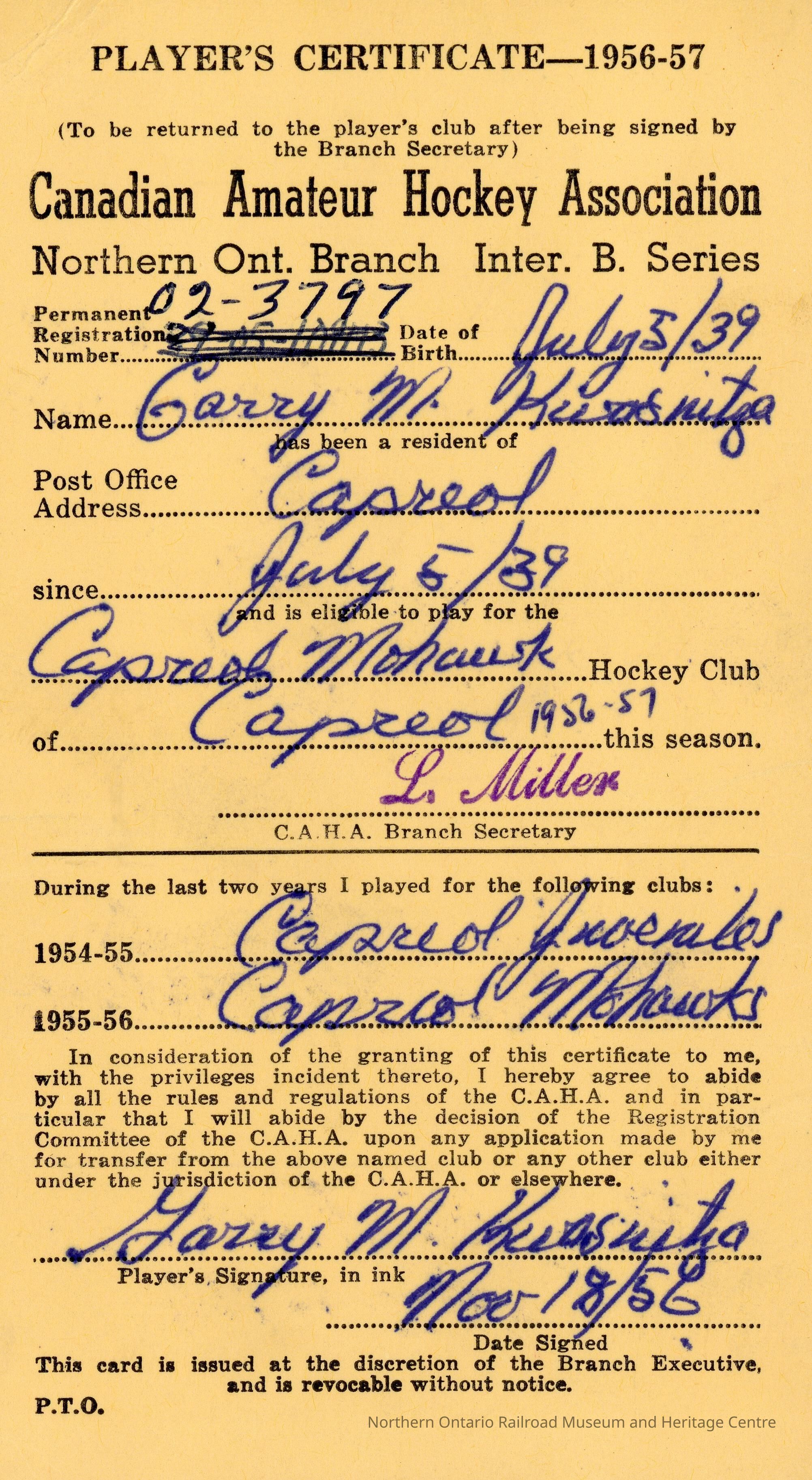 Hockey Player's Registration Certificate belonging to Garry M. KuasuityaEntry/Object ID