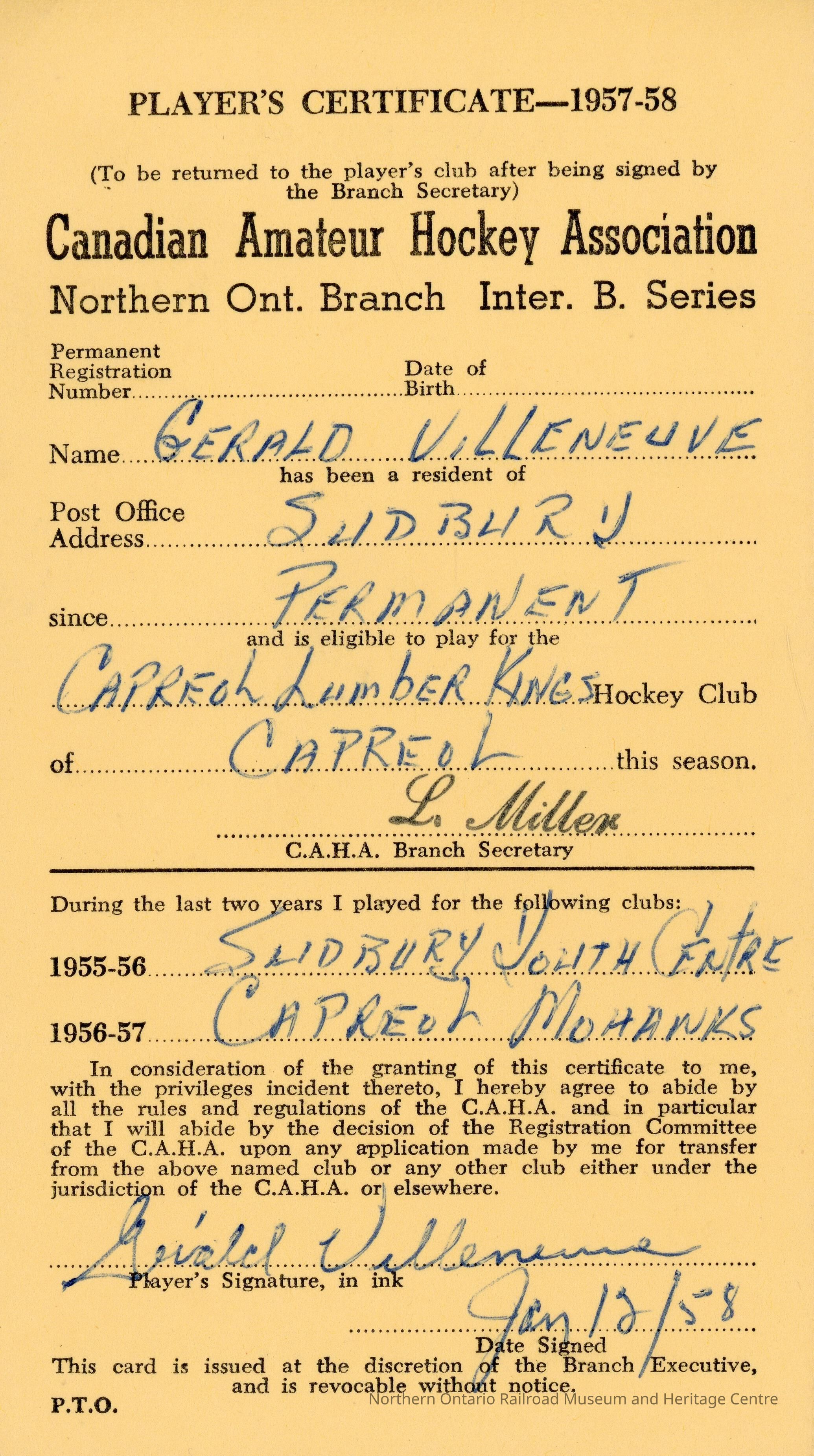 Player registration certificate for the Canadian Amateur Hockey Association belonging to Gerald Villeneuve for the 1957-1958 yearContext