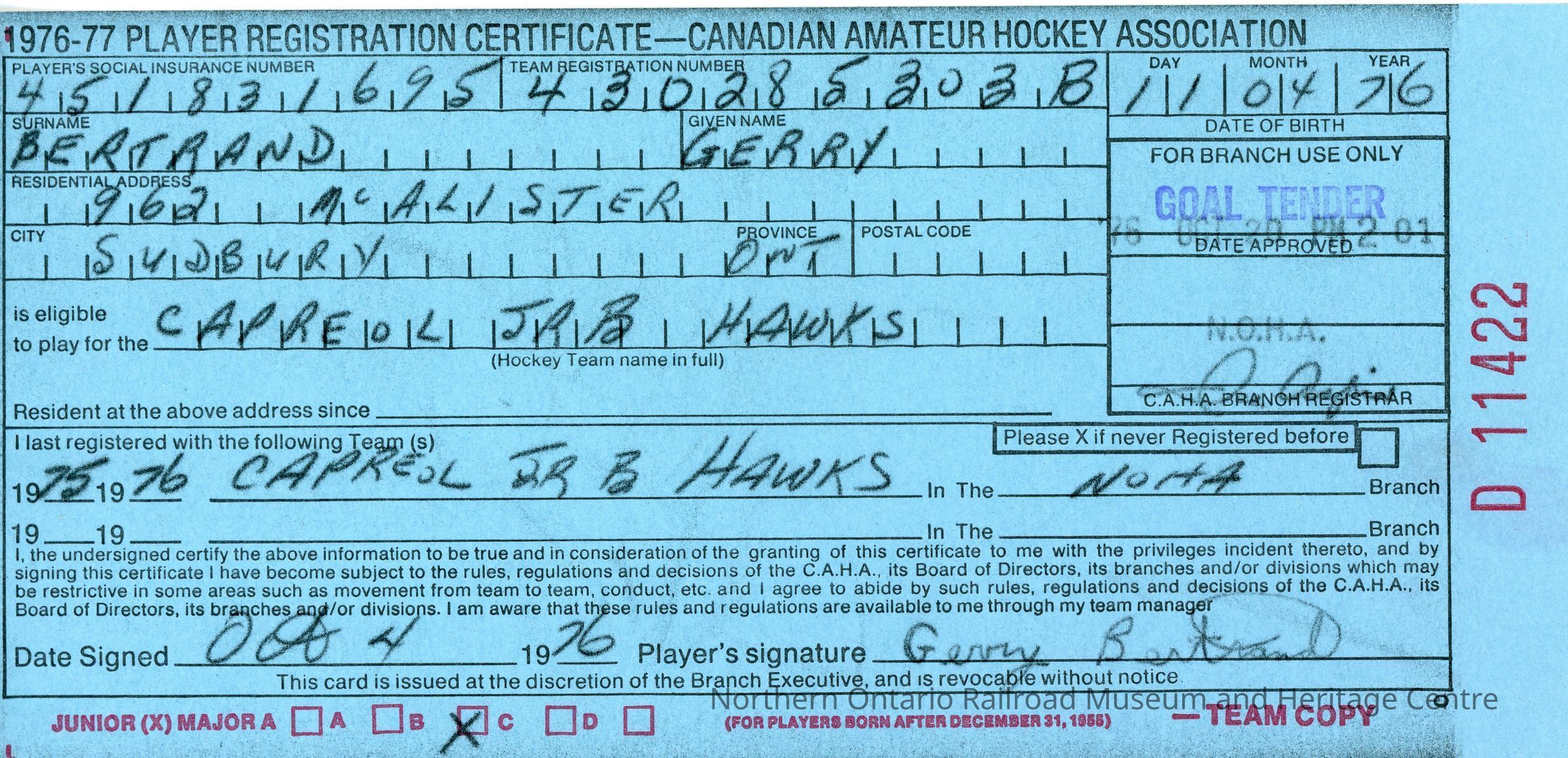 Player registration certificate for the Canadian Amateur Hockey Association belonging to Gerry Bertrand for the 1976-1977 yearContext