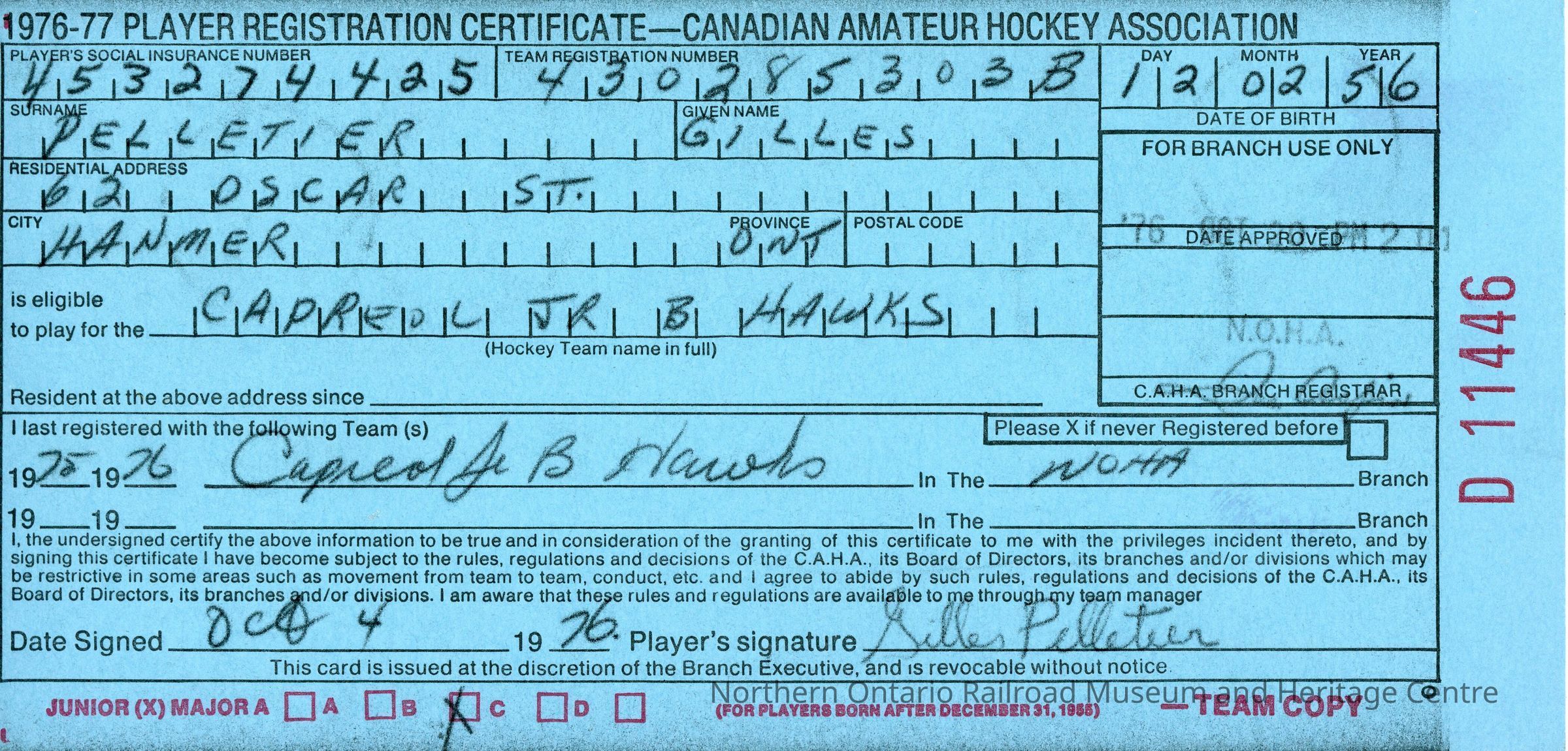 Player registration certificate for the Canadian Amateur Hockey Association belonging to Gilles Pelletier for the 1976-1977 yearContext