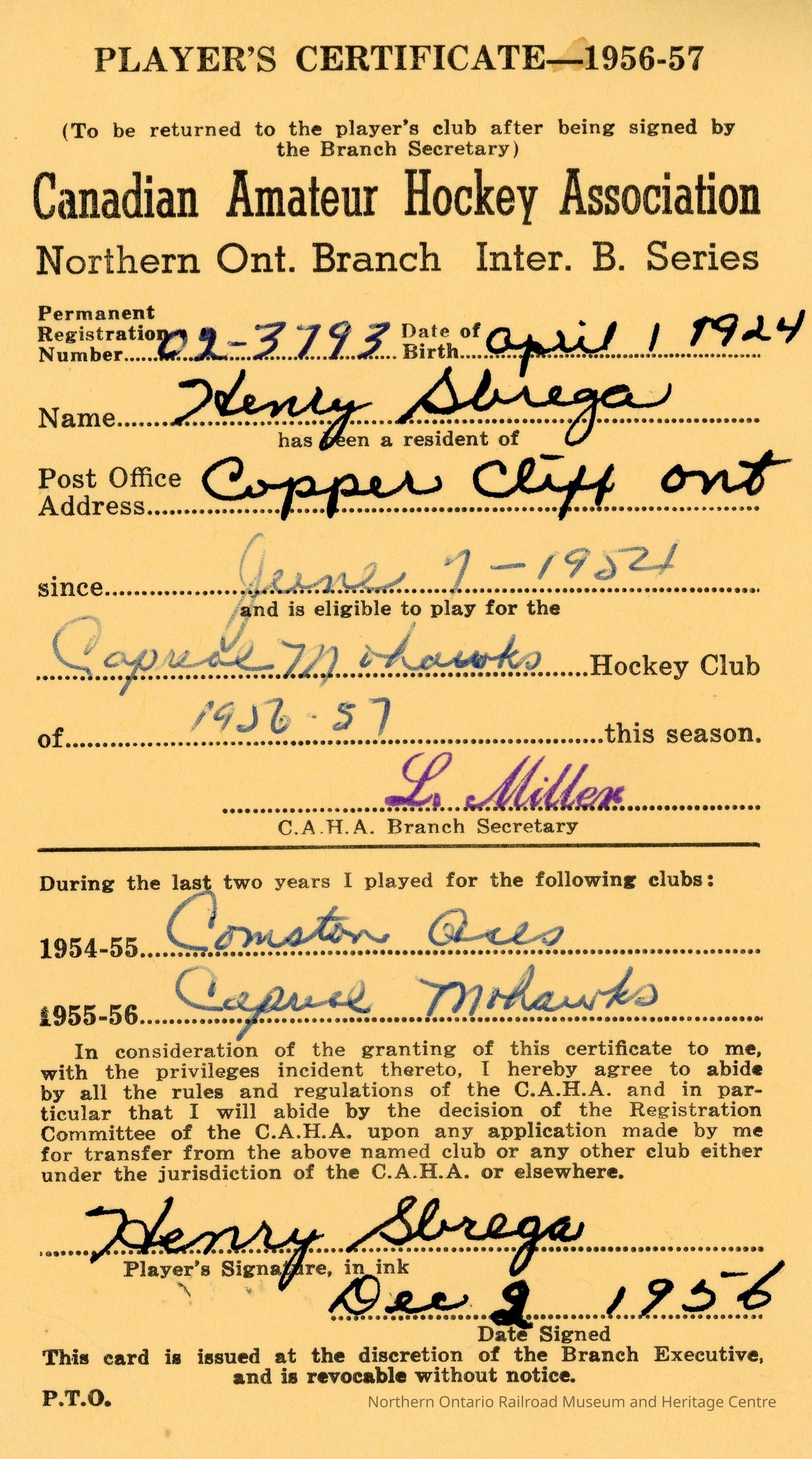Player registration certificate for the Canadian Amateur Hockey Association belonging to Henry Sbrega for the 1956-1957 yearCreator