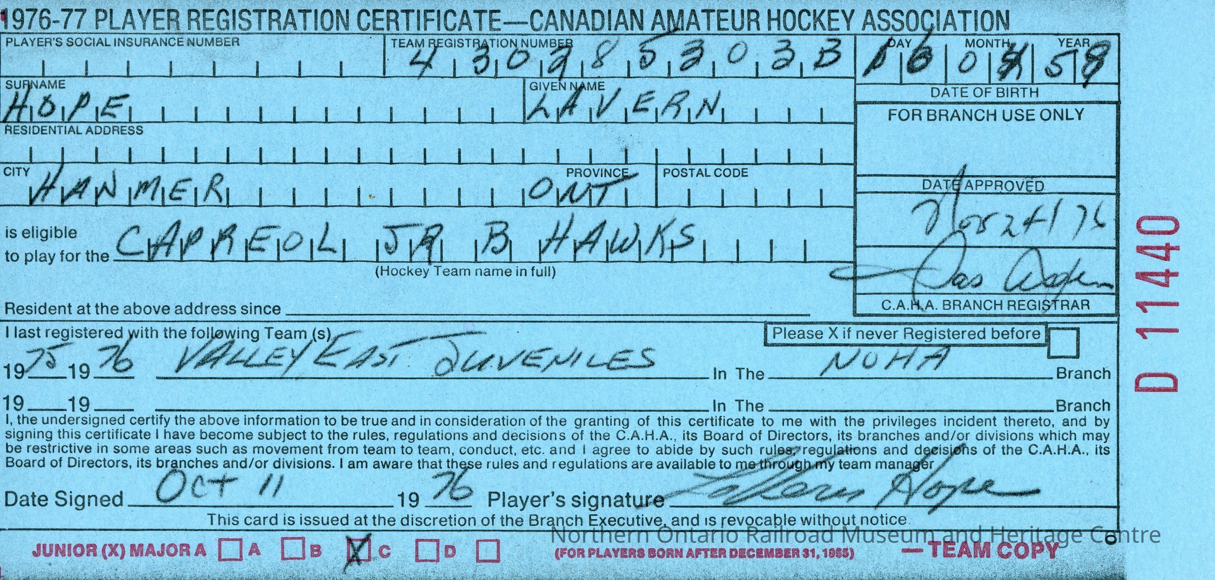 Player registration certificate for the Canadian Amateur Hockey Association belonging to Lavern Hope for the 1976-1977 yearContext