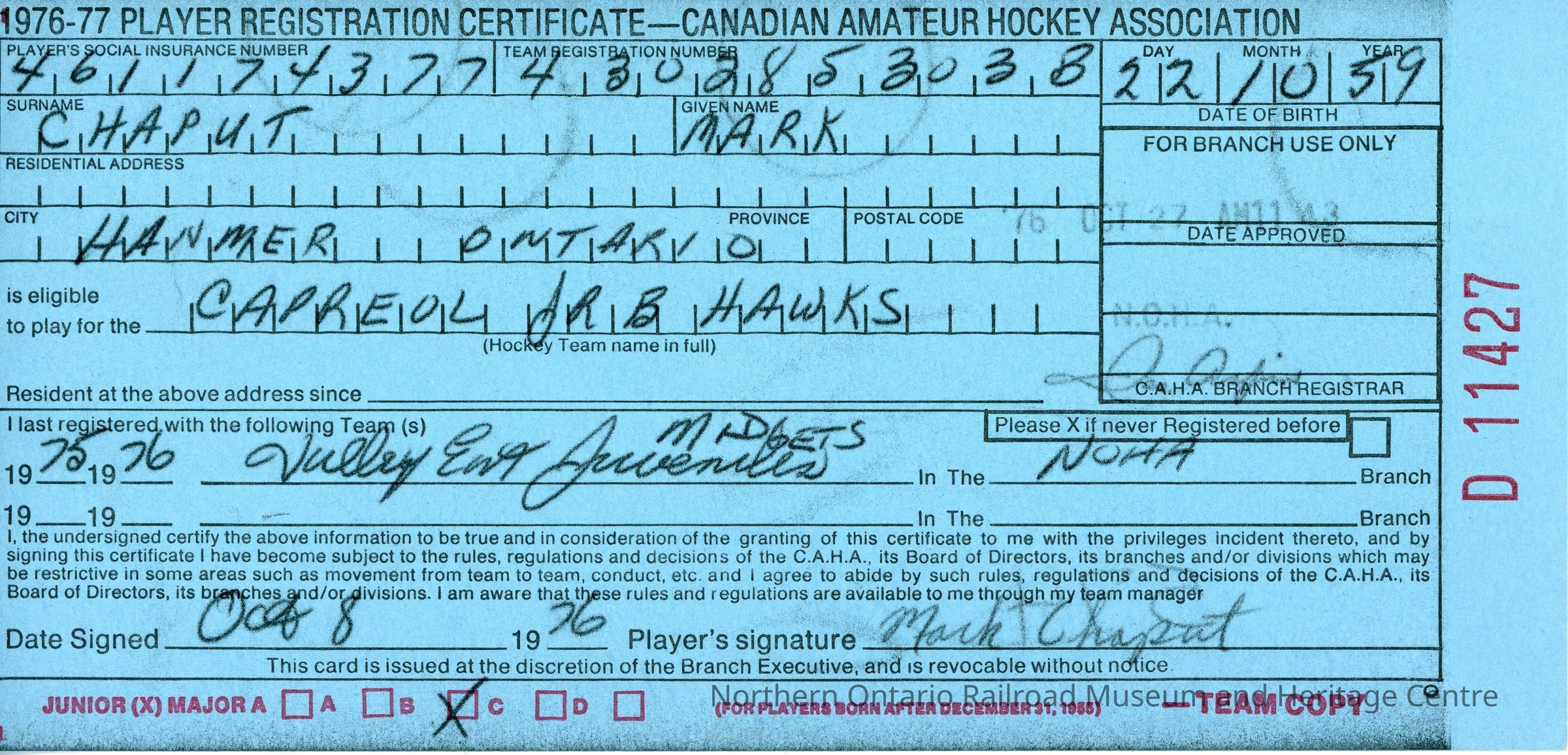 Player registration certificate for the Canadian Amateur Hockey Association belonging to Mark Chaput for the 1976-1977 yearContext