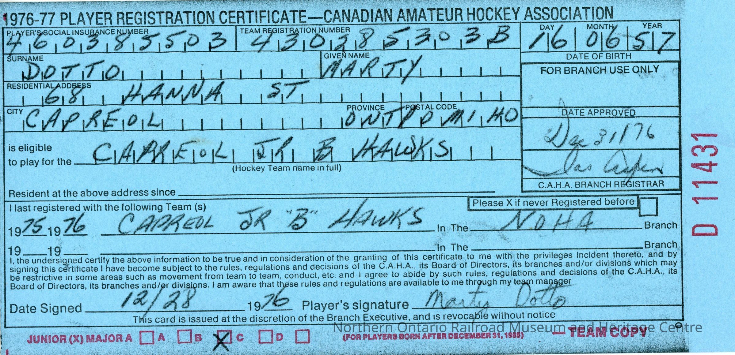 Player registration certificate for the Canadian Amateur Hockey Association belonging to Marty Dotto for the 1976-1977 yearContext
