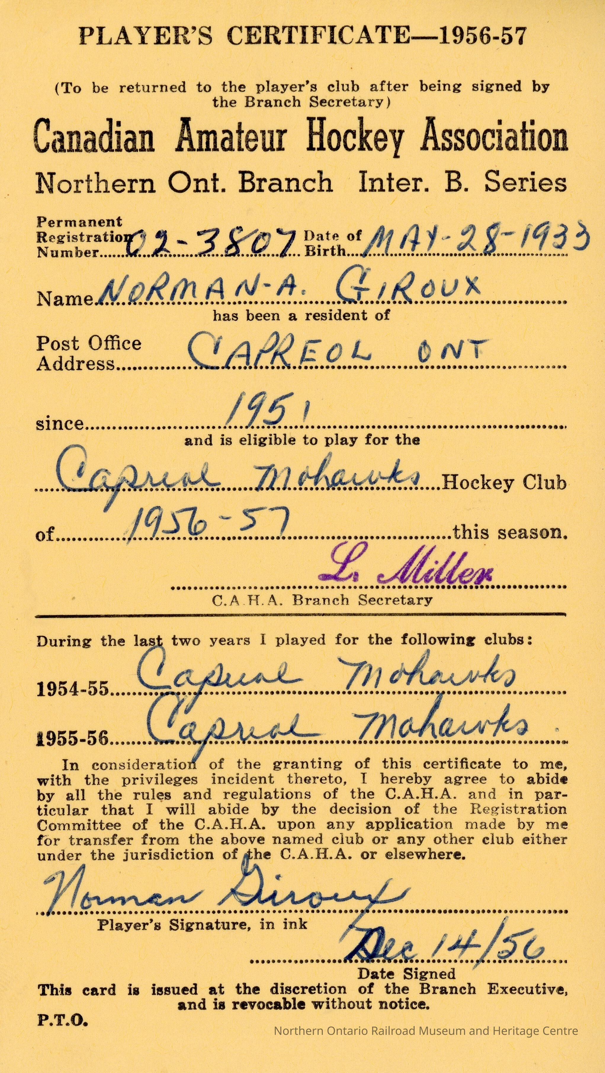 Hockey Player's Registration Certificate belonging to Norman A. GirouxEntry/Object ID