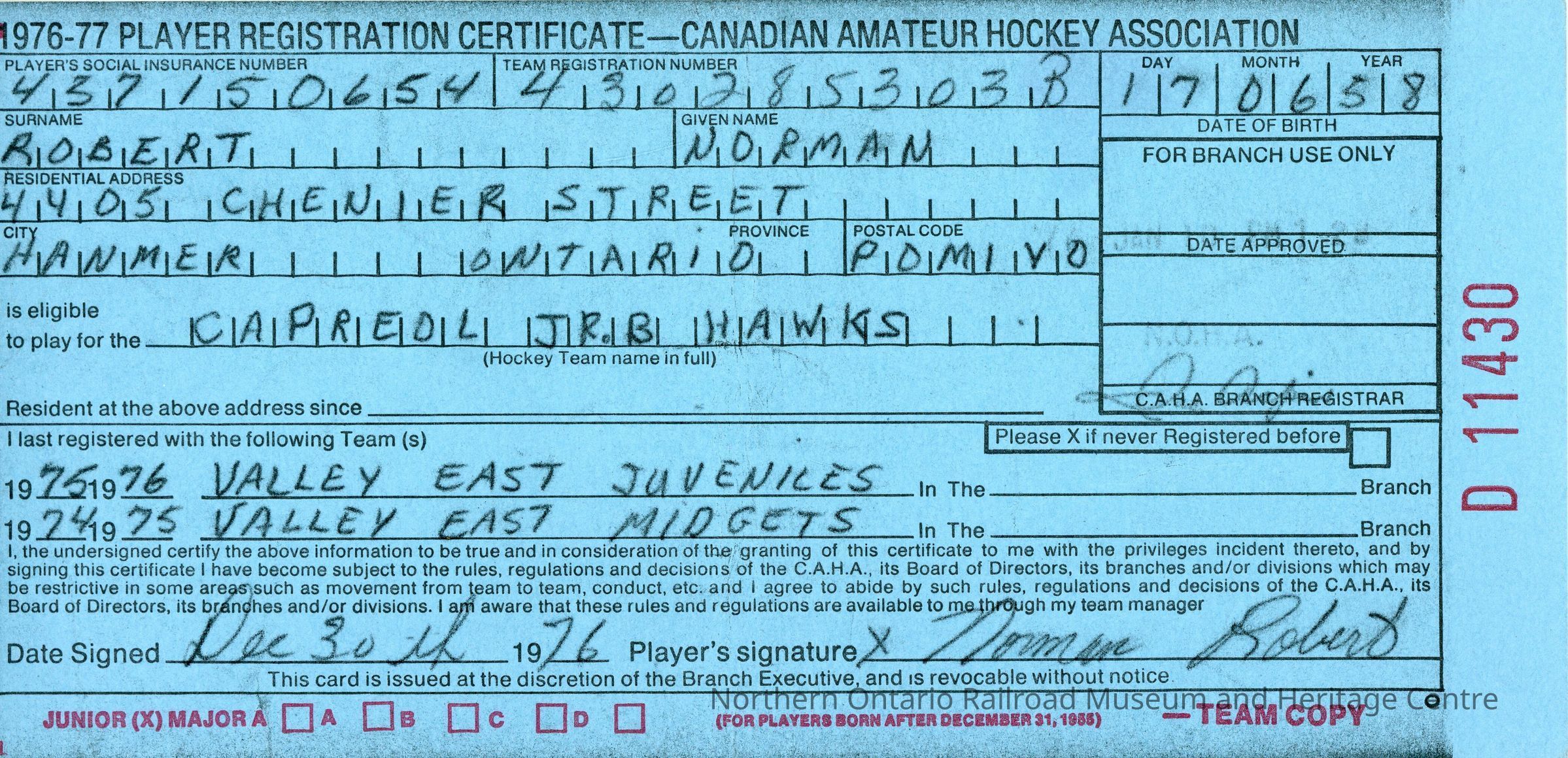 Player registration certificate for the Canadian Amateur Hockey Association belonging to Norman Robert for the 1976-1977 yearContext