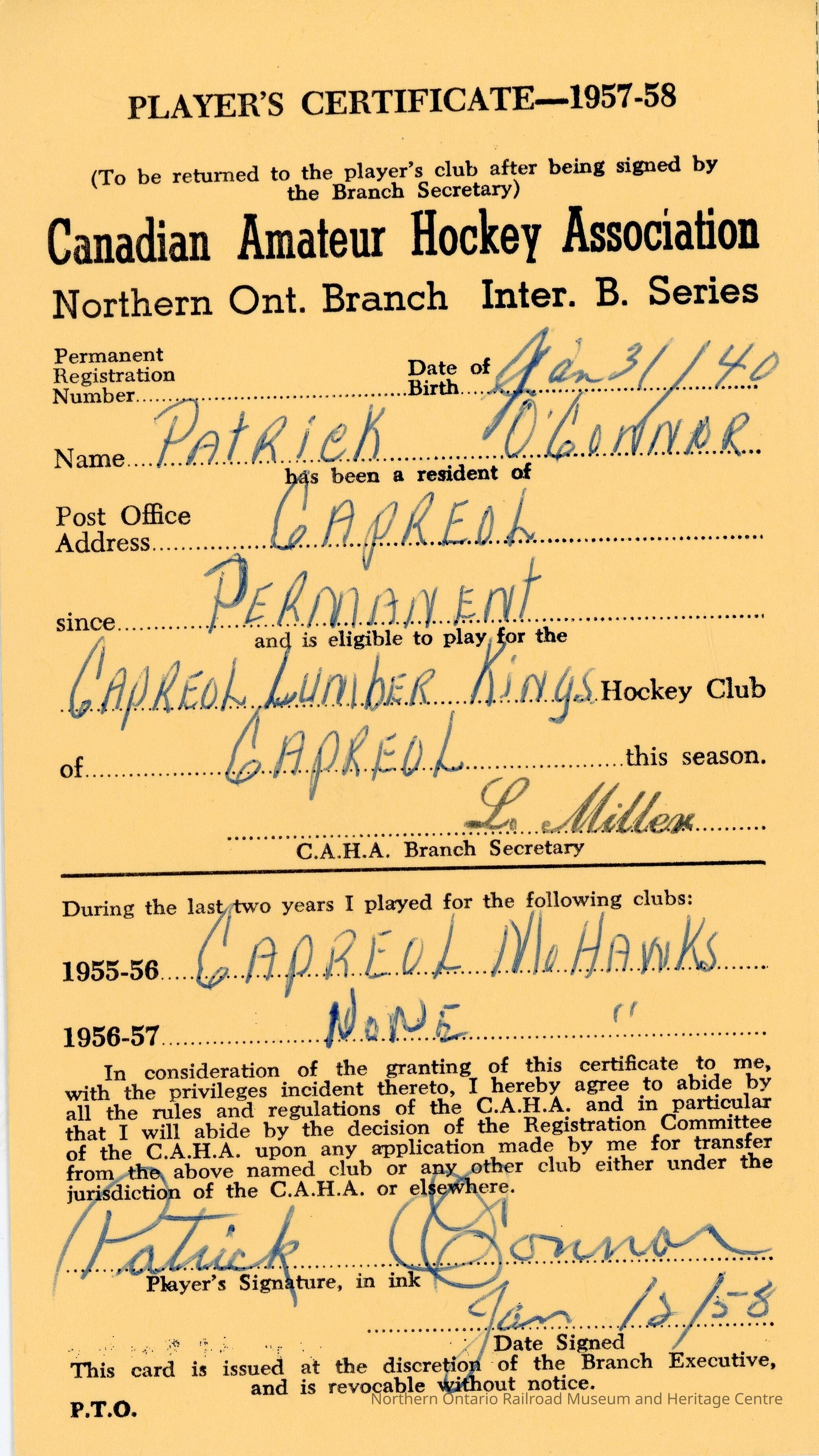 Player registration certificate for the Canadian Amateur Hockey Association belonging to Patrick O'Connor for the 1957-1958 yearContext