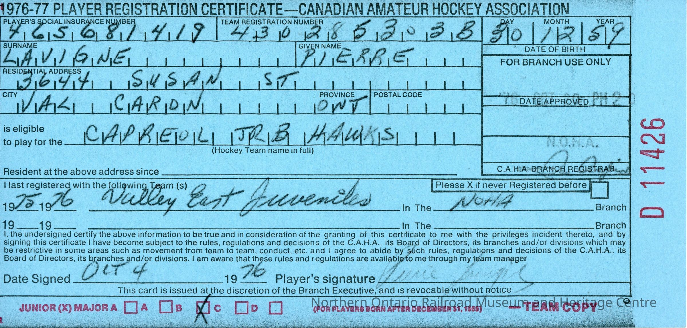 Player registration certificate for the Canadian Amateur Hockey Association belonging to Pierre Lavigne for the 1976-1977 yearContext