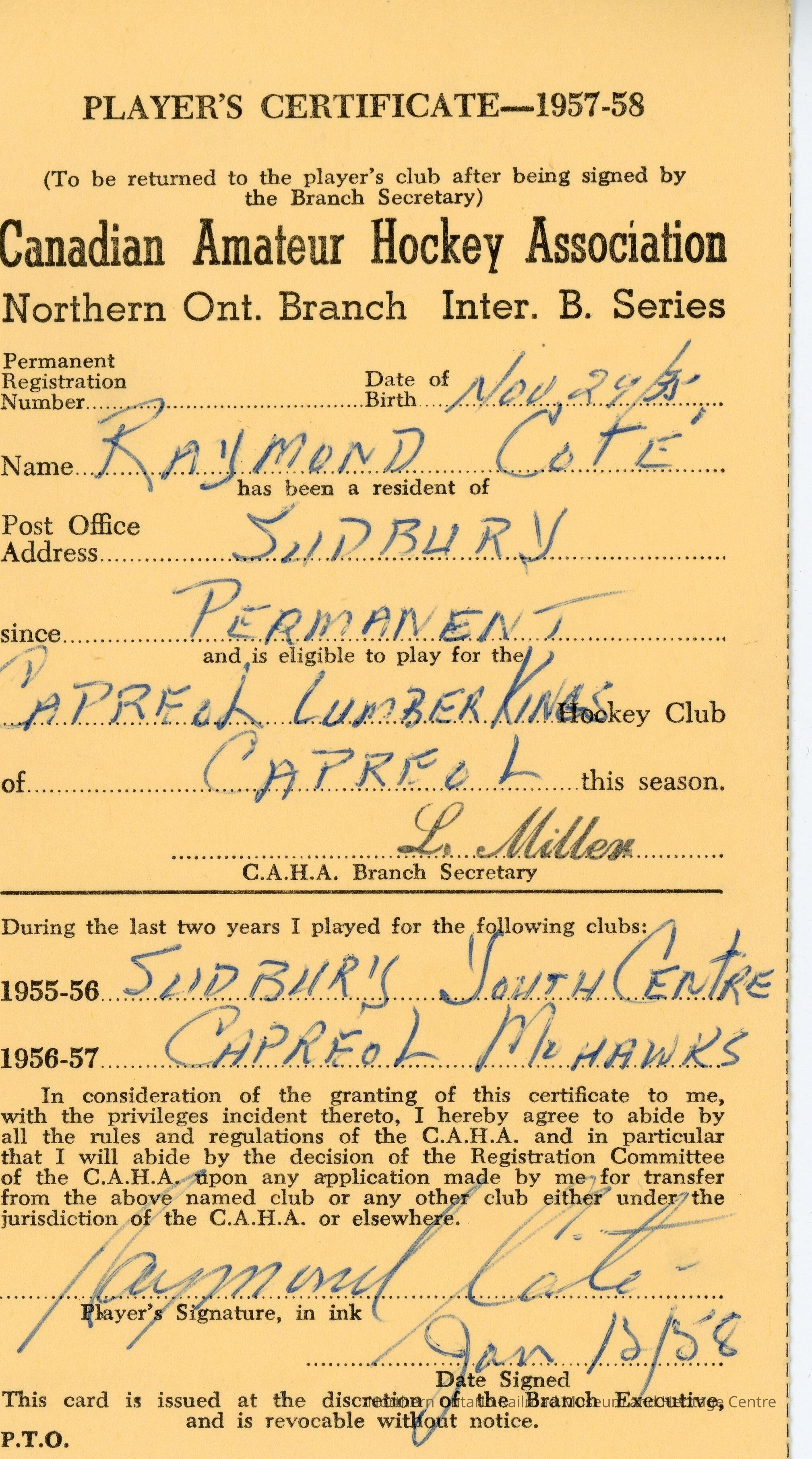 Player registration certificate for the Canadian Amateur Hockey Association belonging to Raymond Cote for the 1957-1958 yearContext