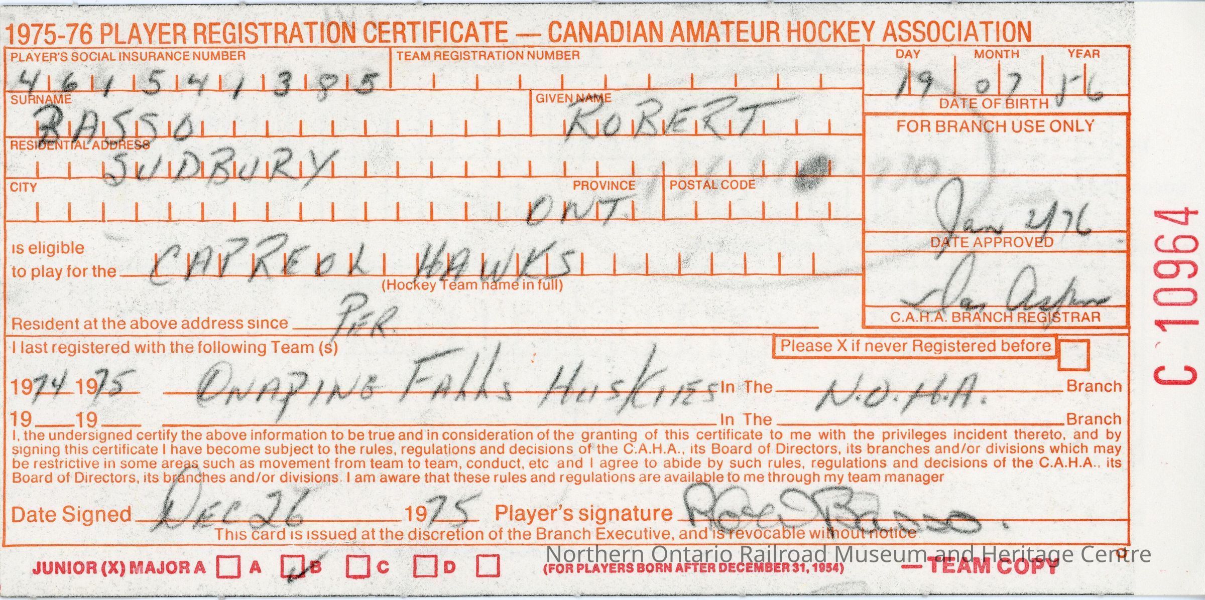 Player registration certificate for the Canadian Amateur Hockey Association belonging to Robert Basso for the 1975-1976 yearContext