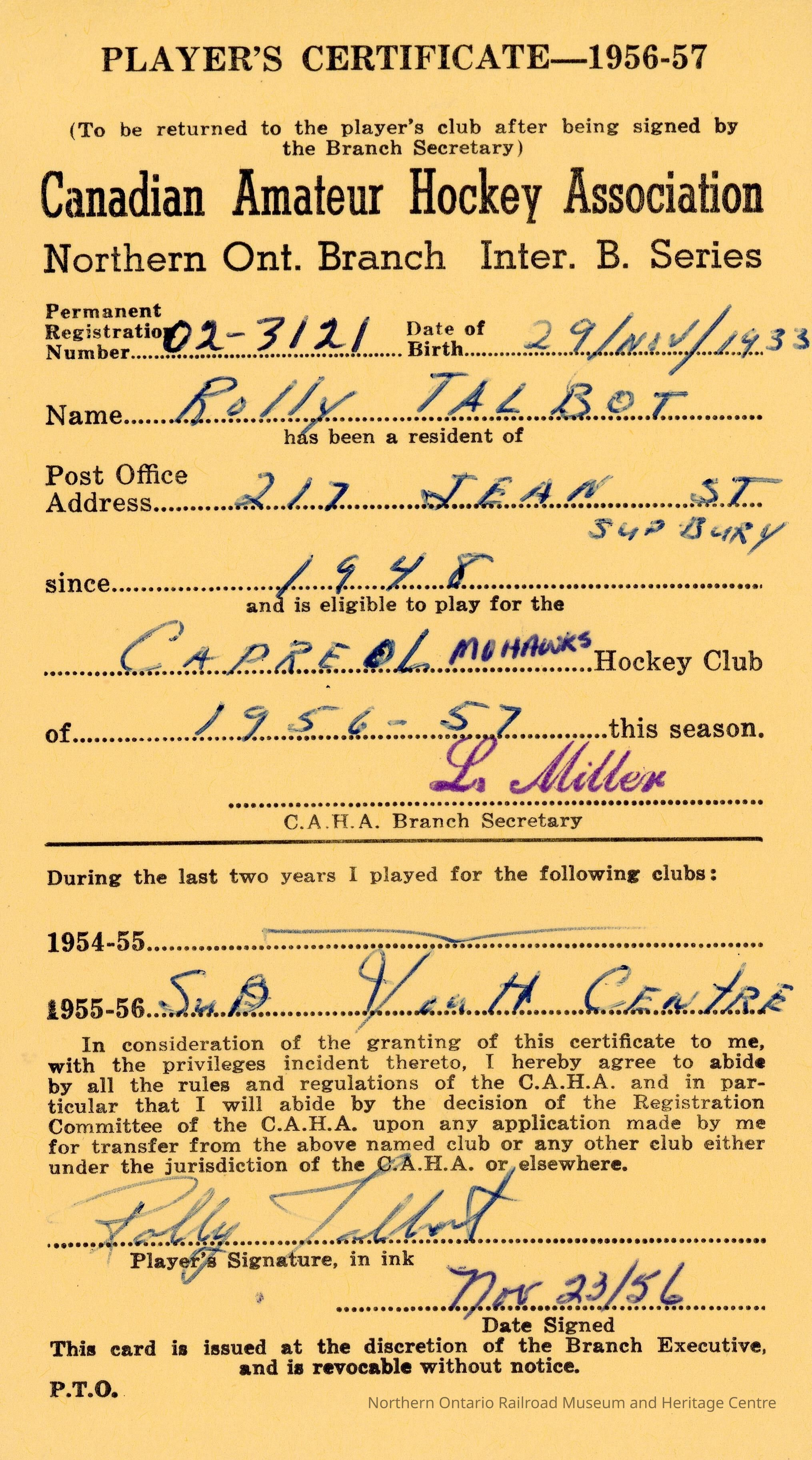 Hockey Player's Registration Certificate belonging to Rolly TalbotEntry/Object ID