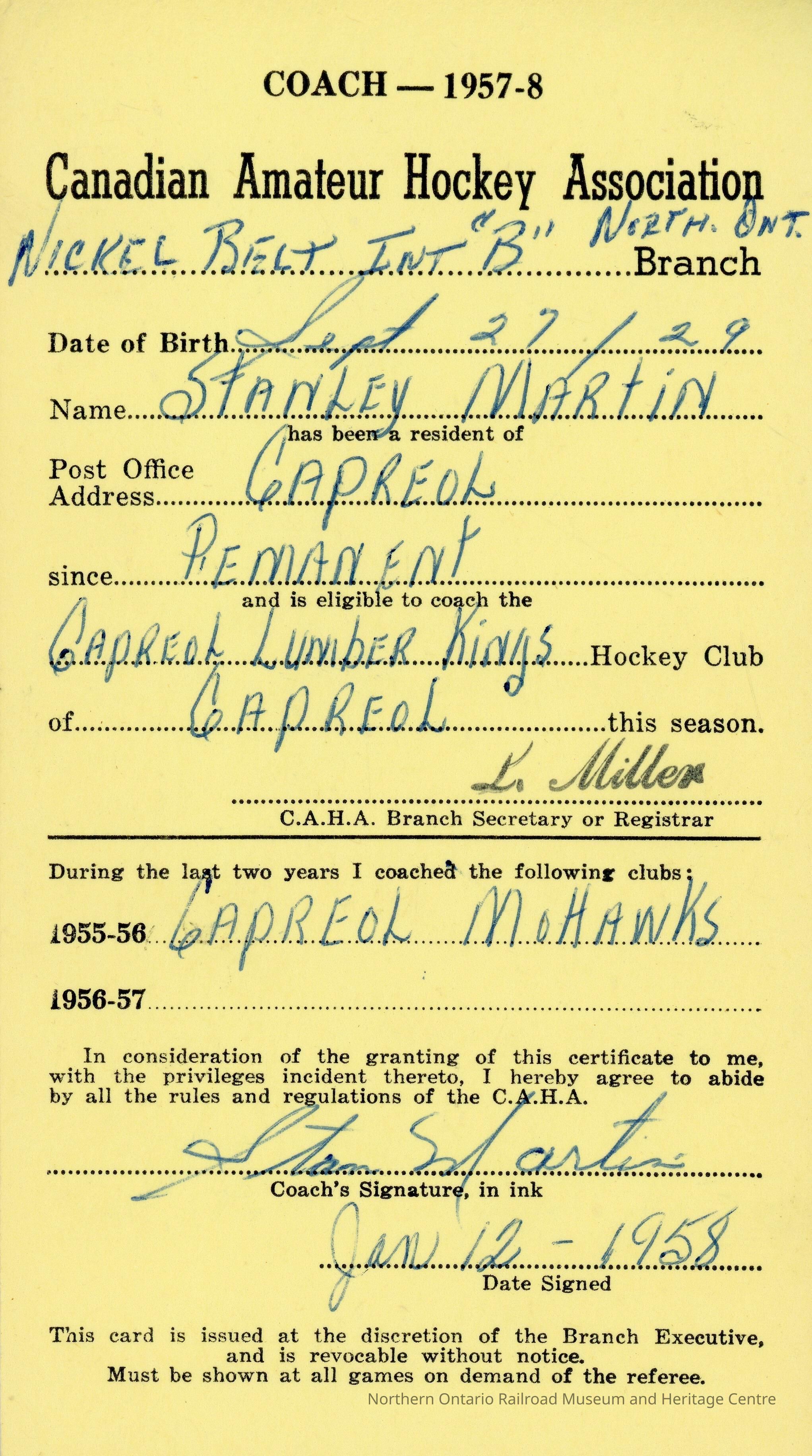 Player registration certificate for the Canadian Amateur Hockey Association belonging to Stanley Martin for the 1957-1958 yearCreator