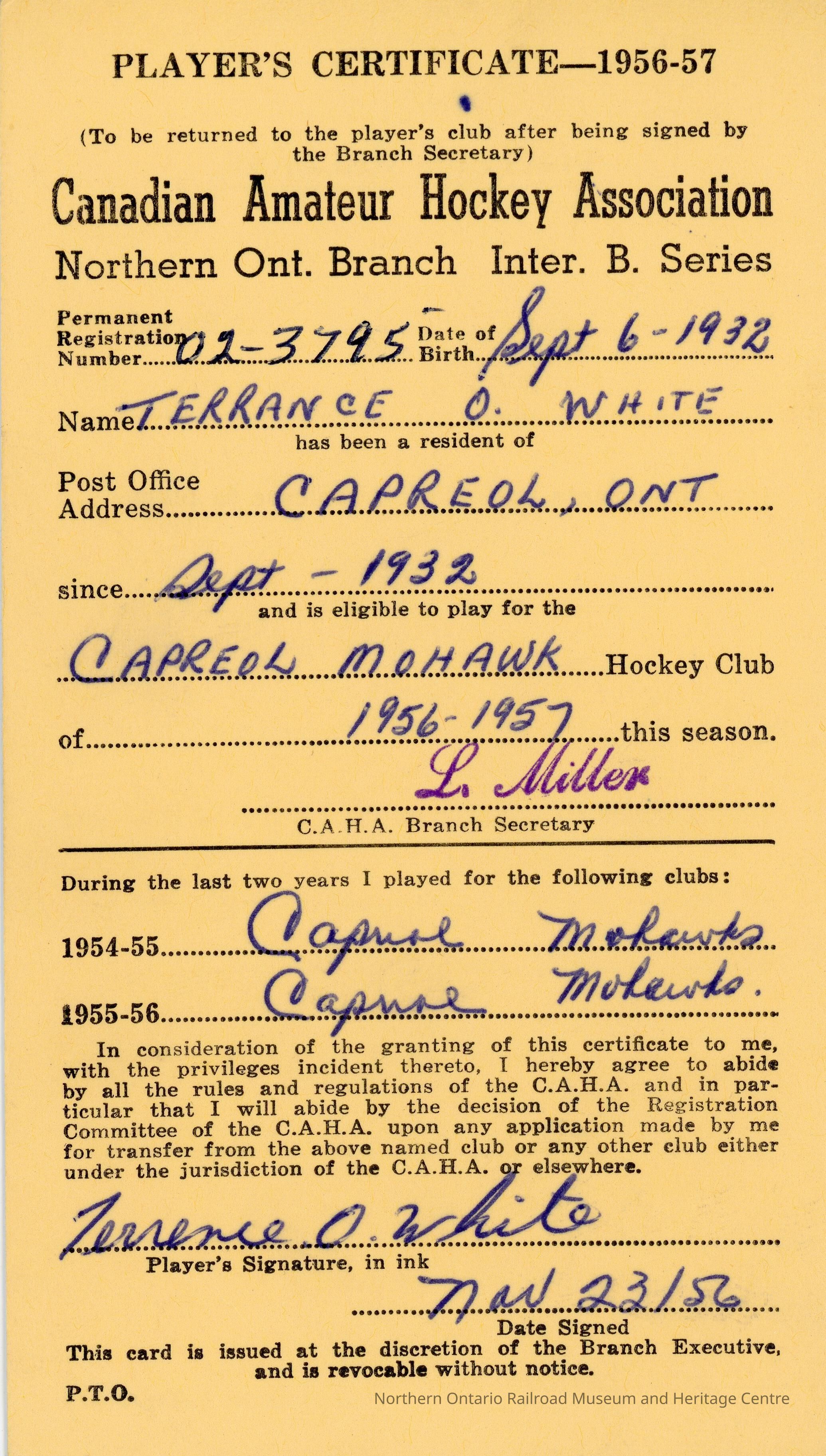Player registration certificate for the Canadian Amateur Hockey Association belonging to Terrance O'White for the 1956-1957 yearContext
