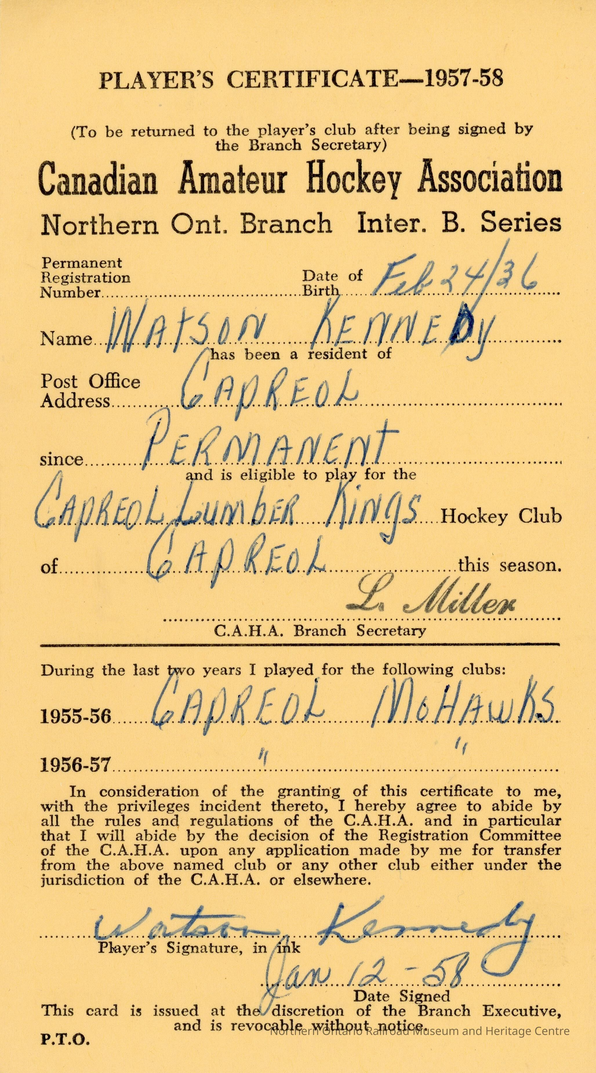 Player registration certificate for the Canadian Amateur Hockey Association belonging to Watson Kennedy for the 1957-1958 yearContext