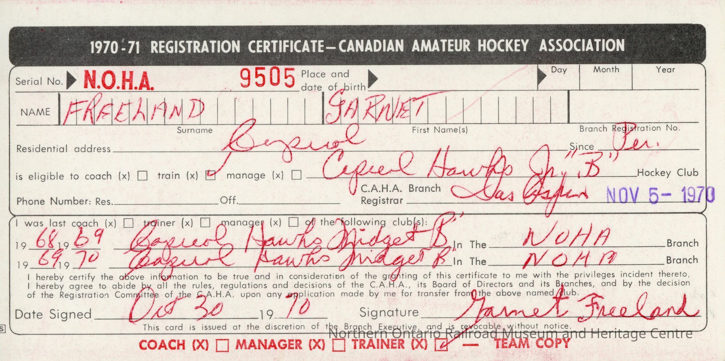 Trainer registration certificate for the Canadian Amateur Hockey Association belonging to Garnet Freeland for the 1970-1971 yearCreator