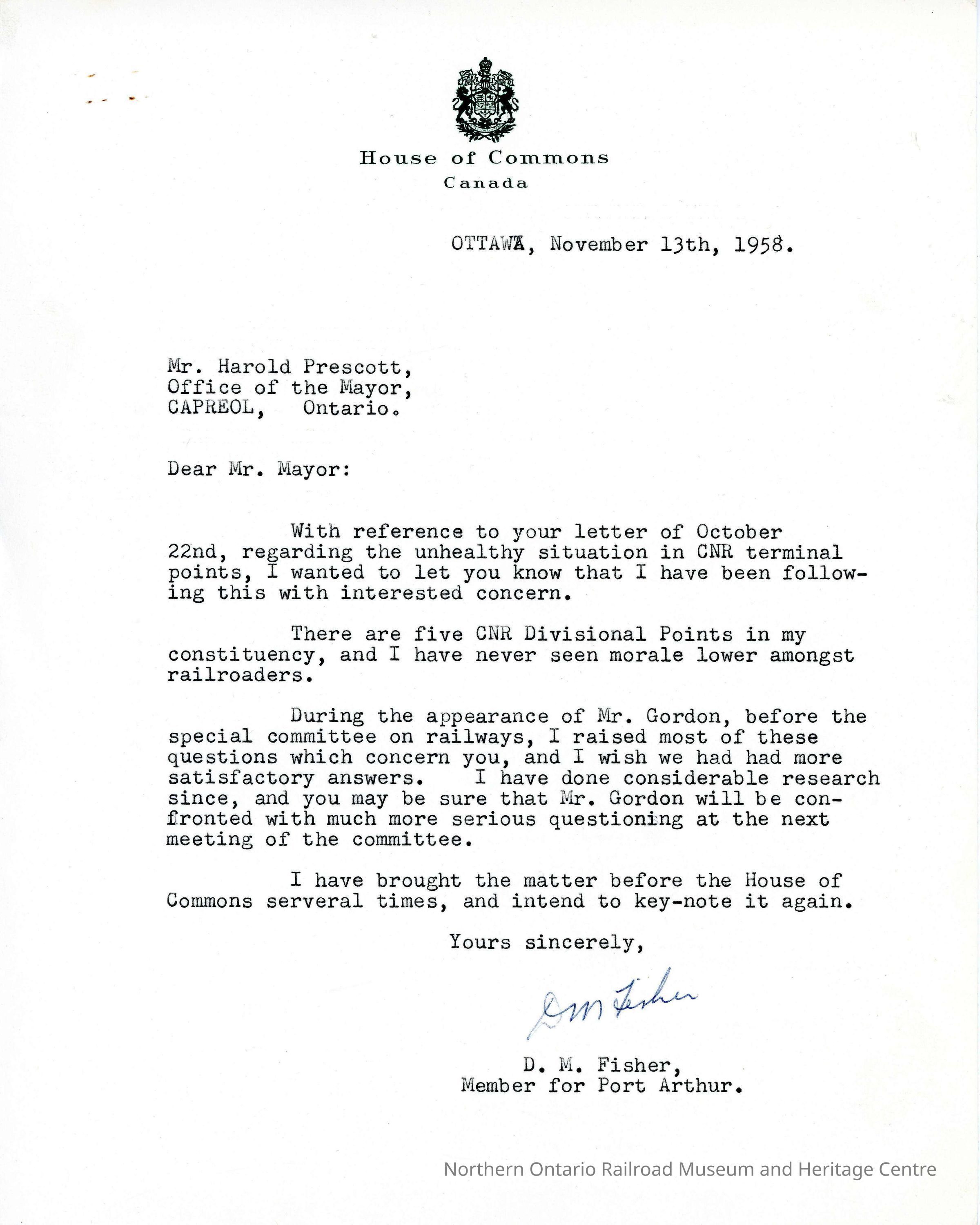 House of Commons Letter, November 13 1958, to Harold Prescott from D M Fisher regarding CNR terminal PointsDescription