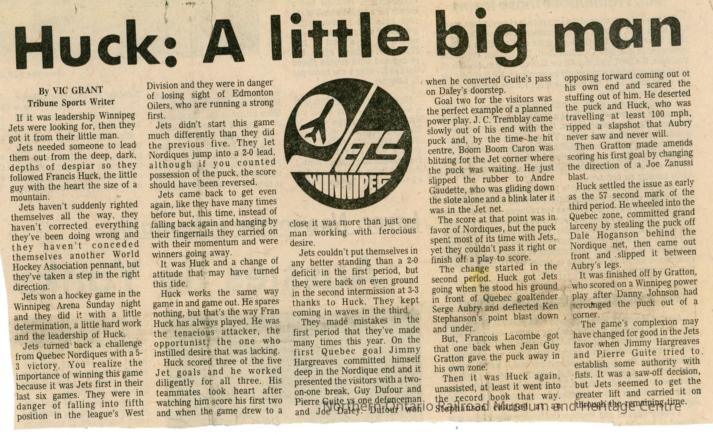 Huck: A Little Big Man" in The Winnipeg Tribune, Monday, December 3, 1973 (Pg 13). Photo of Ray Thomas (next page from preview shown here, pdf is multiple pages) refereeing game.Collection
