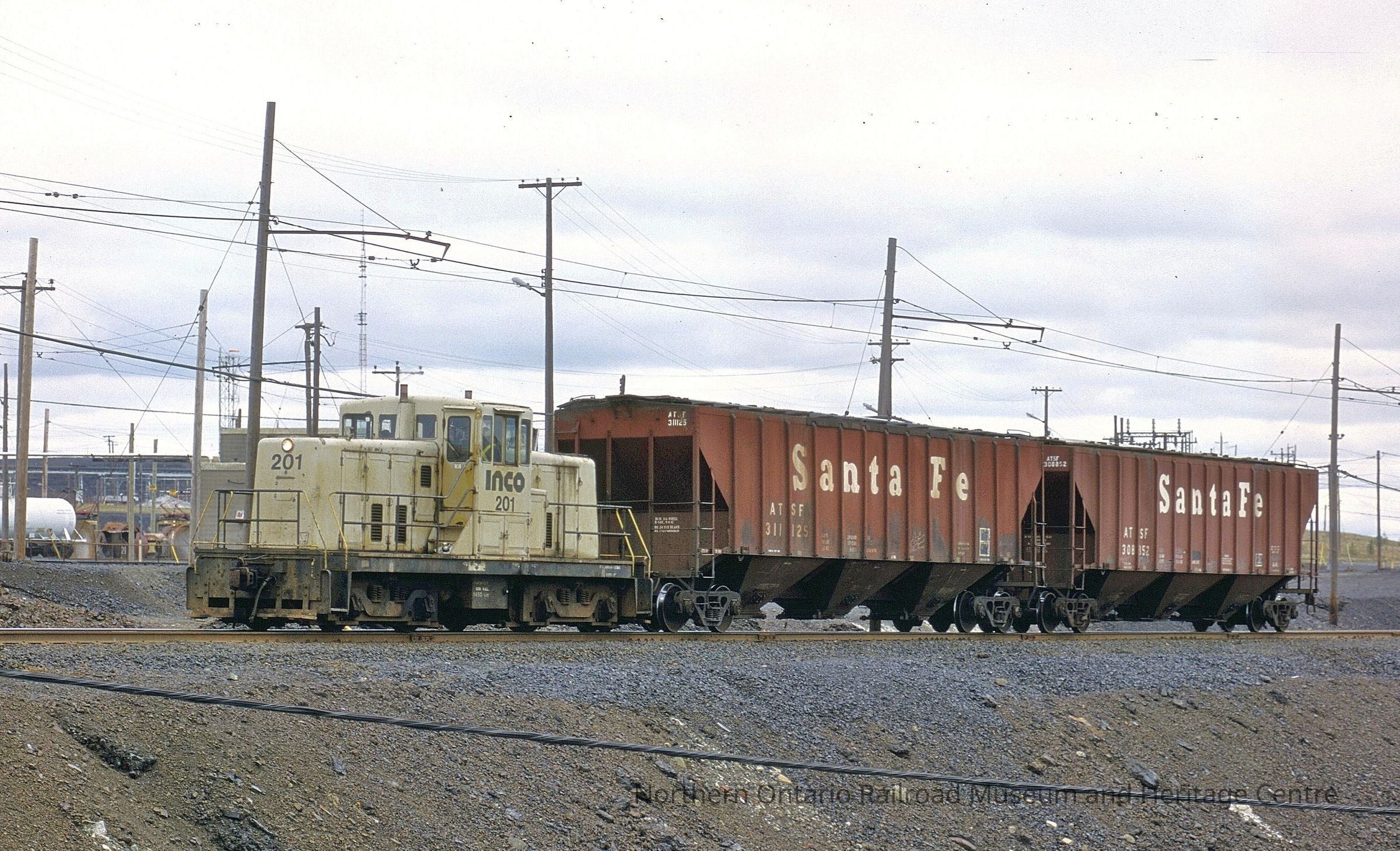 Coloured photograph showing the International Nickel Company of Canada's diesel locomotive #201 pulling two "Santa Fe" branded ore cars. The image shows the front and left side of the locomotive and ore cars.Photograph Details
