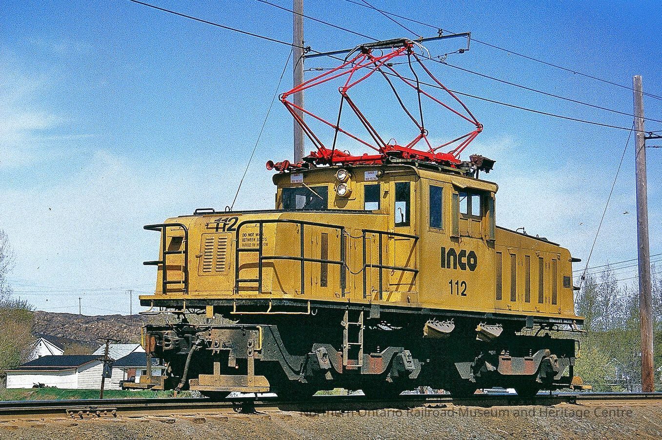 Coloured photograph showing the International Nickel Company of Canada's electric locomotive #112. The image shows the front and left side of the locomotive, it is on a track but not pulling any cars.Photograph Details