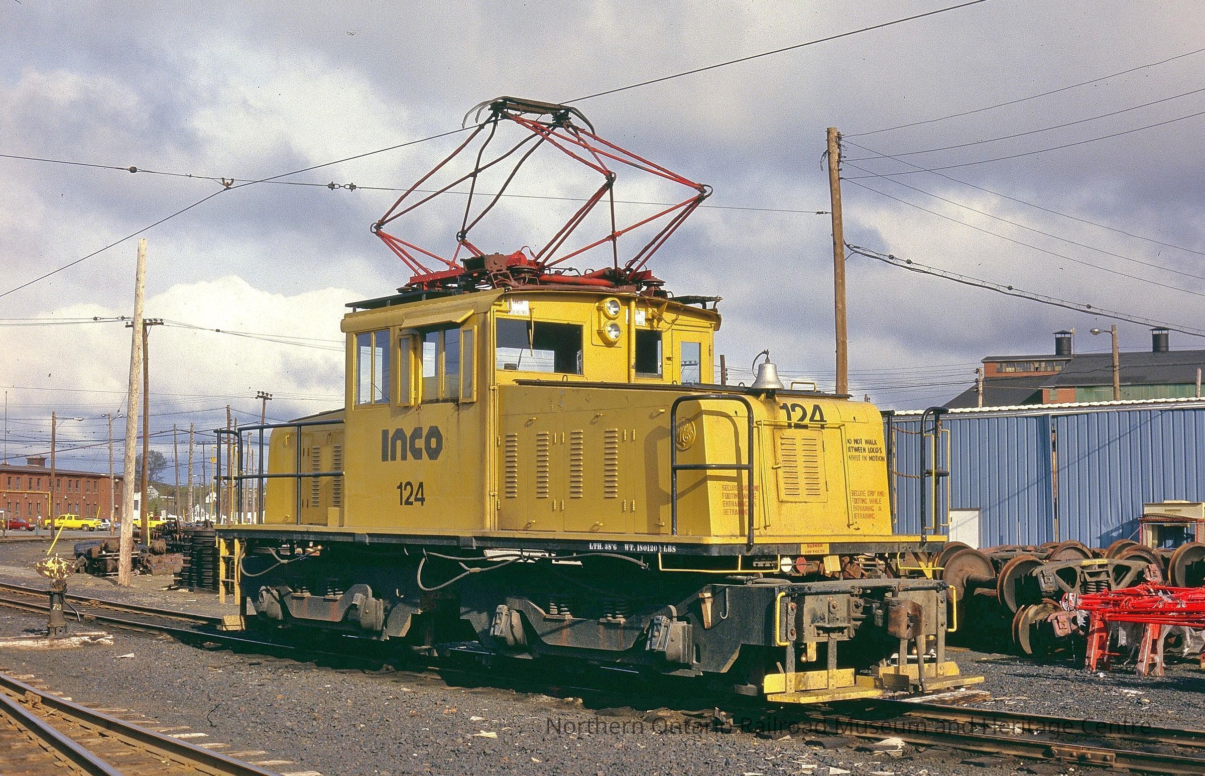 Coloured photograph showing the International Nickel Company of Canada's electric locomotive #124. The image shows the front and right side of the locomotive, it is not pulling any cars.Photograph Details