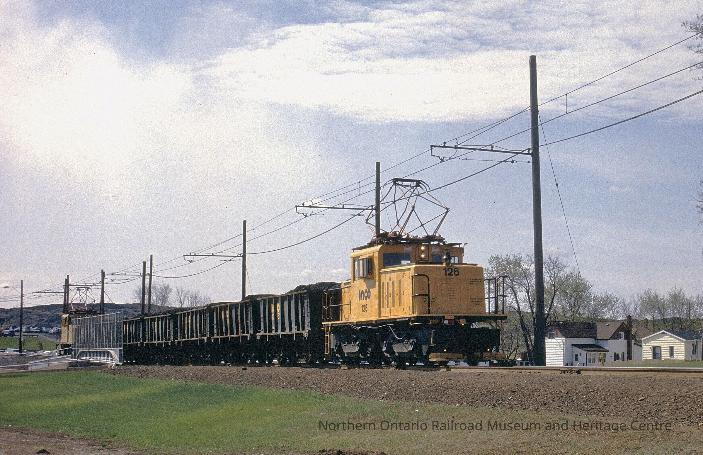 Coloured photograph showing the International Nickel Company of Canada's electric locomotive #126 pulling ore cars. The image shows the front and the left side of the locomotive.There are also two houses in the background.Photograph Details