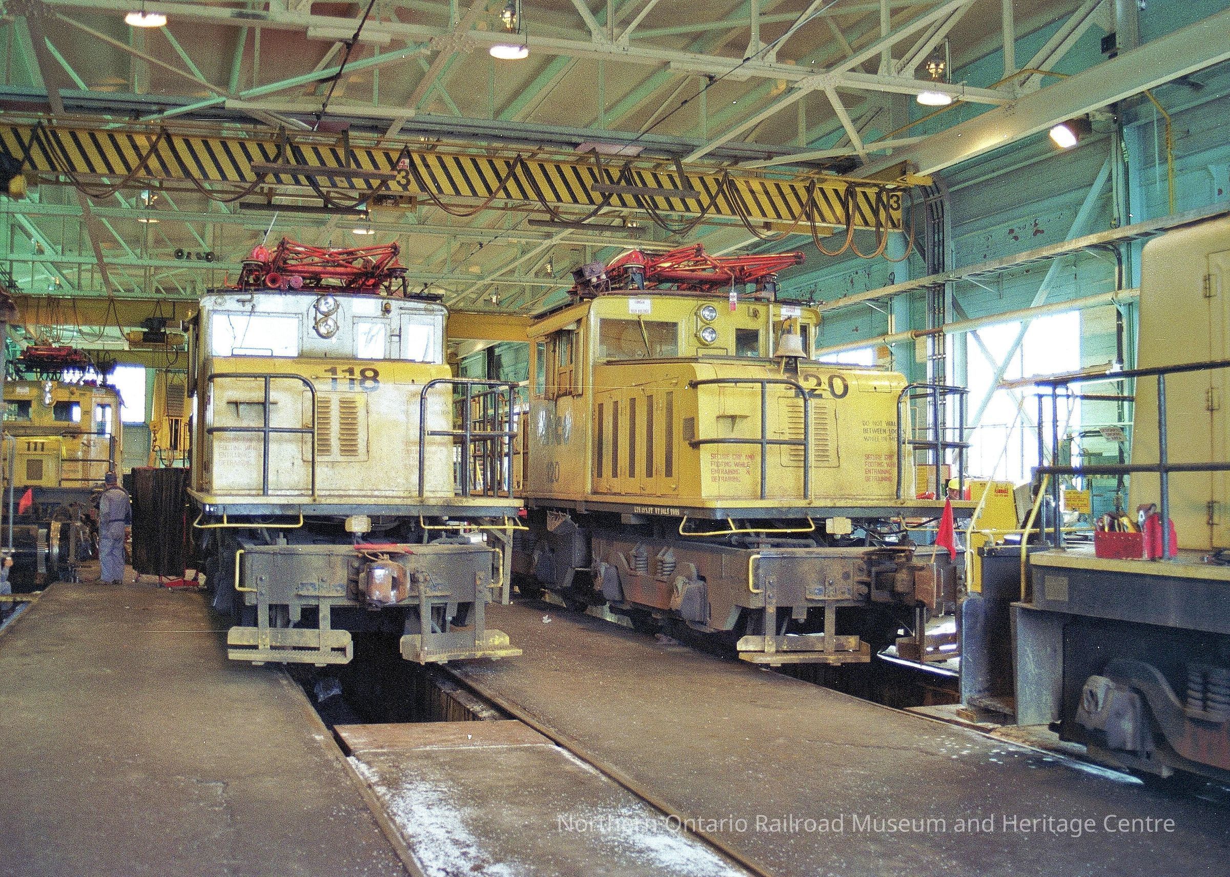 Coloured photograph showing three of the International Nickel Company of Canada's electric locomotives numbers 111, 118, and 120. A fourth is partially visible but the number is not visible. The locomotives are in what appears to be a workshop or garage.Photograph Details