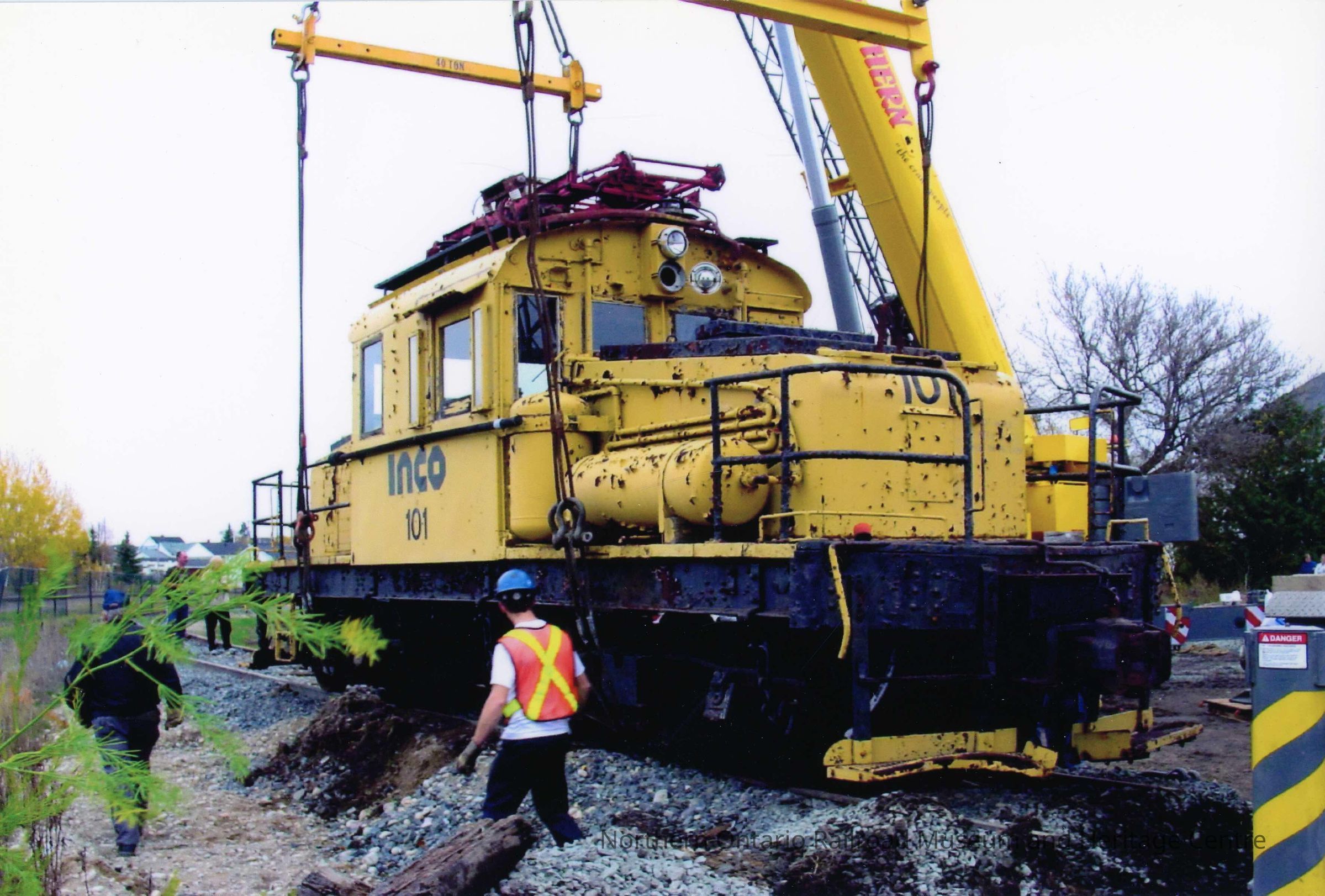 Coloured photograph showing INCO locomotive #101 being placed onto the tracks at Prescott Park, to be displayed at the Northern Ontario Railroad Museum and Heritage CentrePhotograph Details