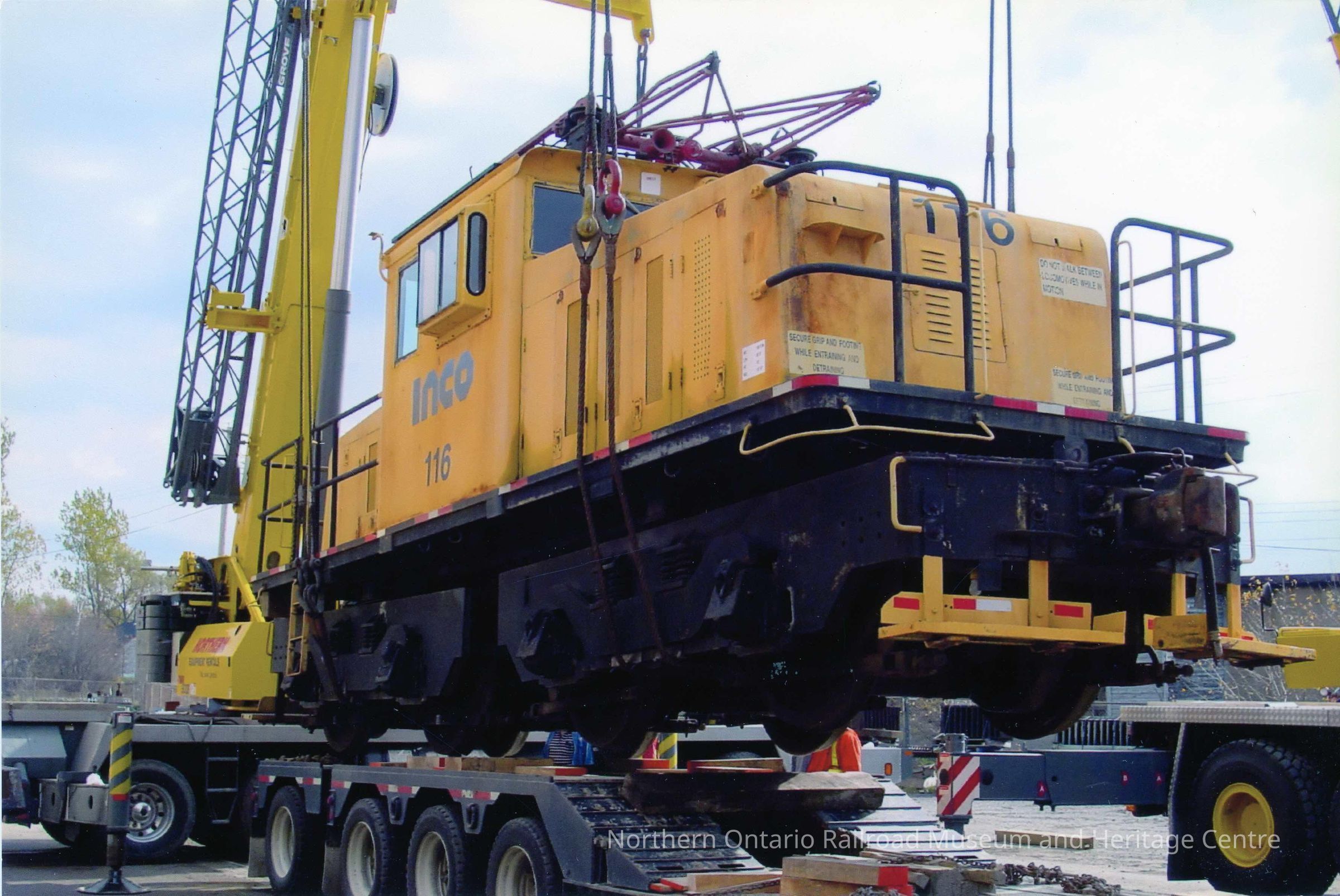 Coloured photograph showing INCO locomotive #116 being placed onto a flatbed truck so that it could be brought to Prescott Park to be displayed at the Northern Ontario Railroad Museum and Heritage Centre.Photograph Details
