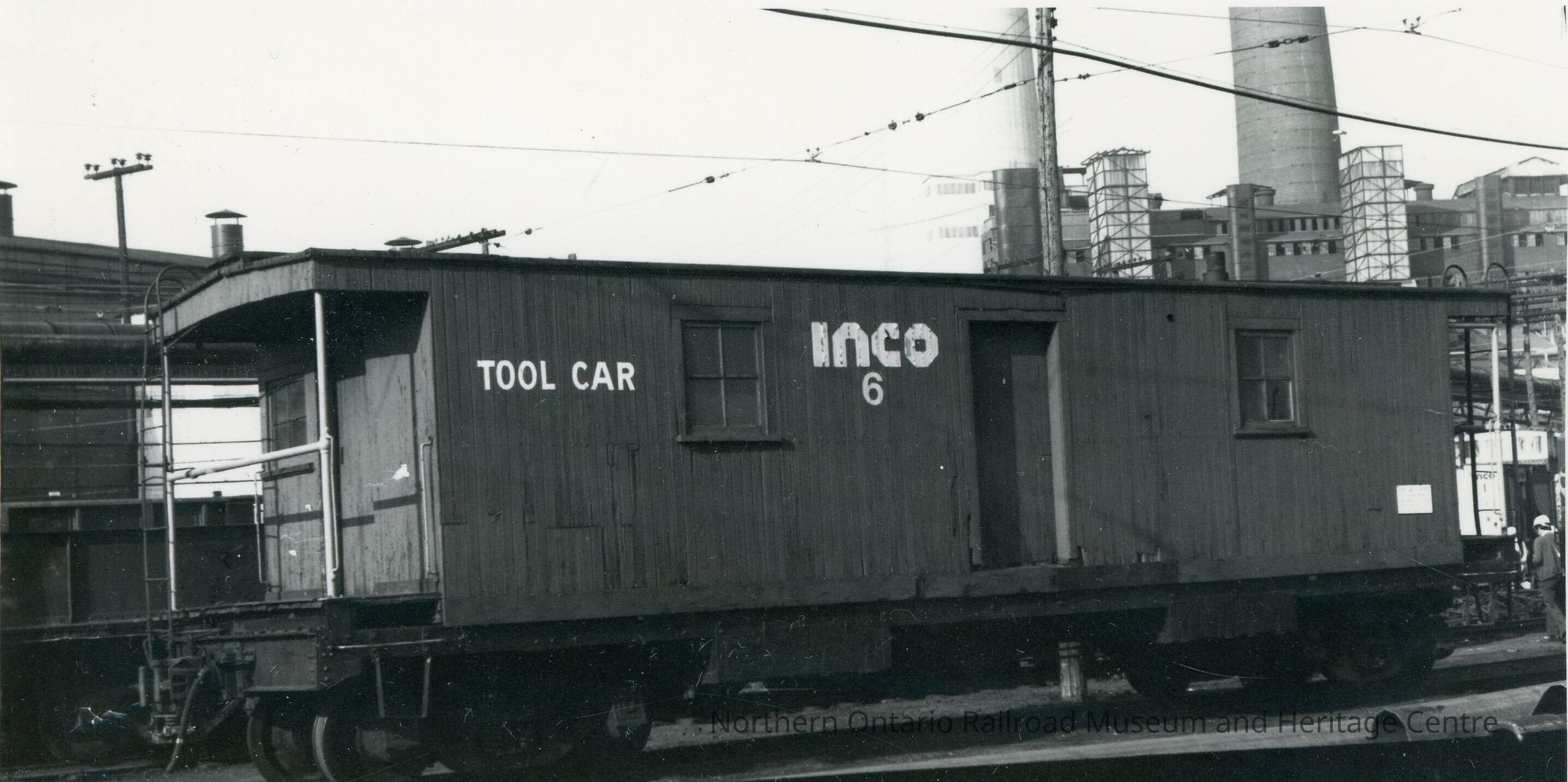 Black and white photograph showing the International Nickel Company of Canada's Tool Car #6. The image is a side profile, showing the left side of the tool carPhotograph Details