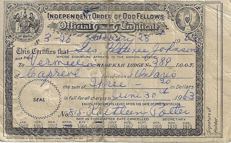 Official certificate for payment of dues for the Independent Order of Odd Fellows.Context