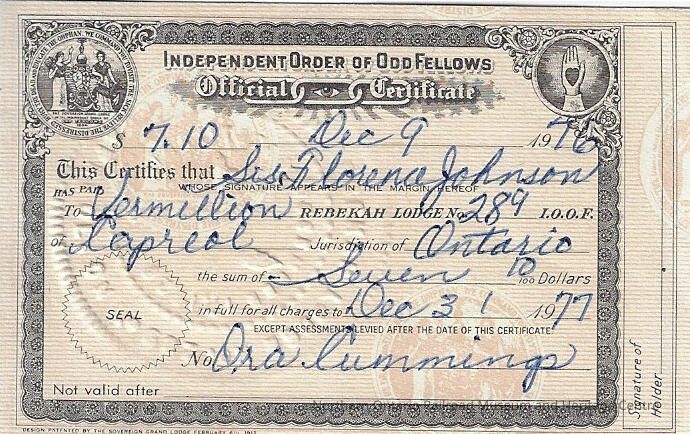 Official certificate for payment of dues for the Independent Order of Odd Fellows. The certificate was given to Sister Florence Johnson on December 9th, 1976 for the amount of $7.10 for membership dues.Creator