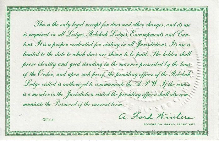 Official certificate for payment of dues for the Independent Order of Odd Fellows.Context