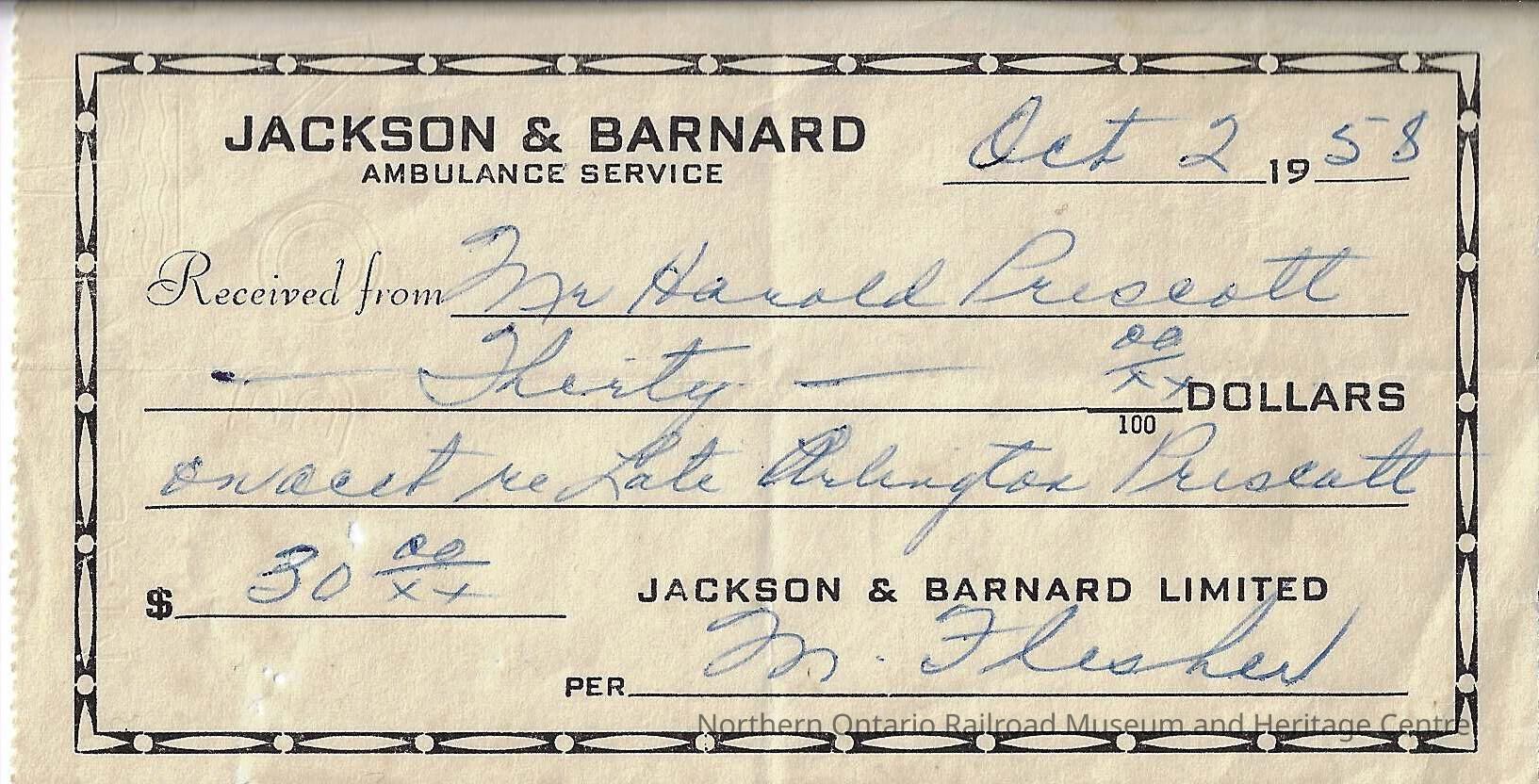 receipt of sale for ambulance service to Mr. Harold Prescott from Jackson and Barnard Ambulance ServiceCollection