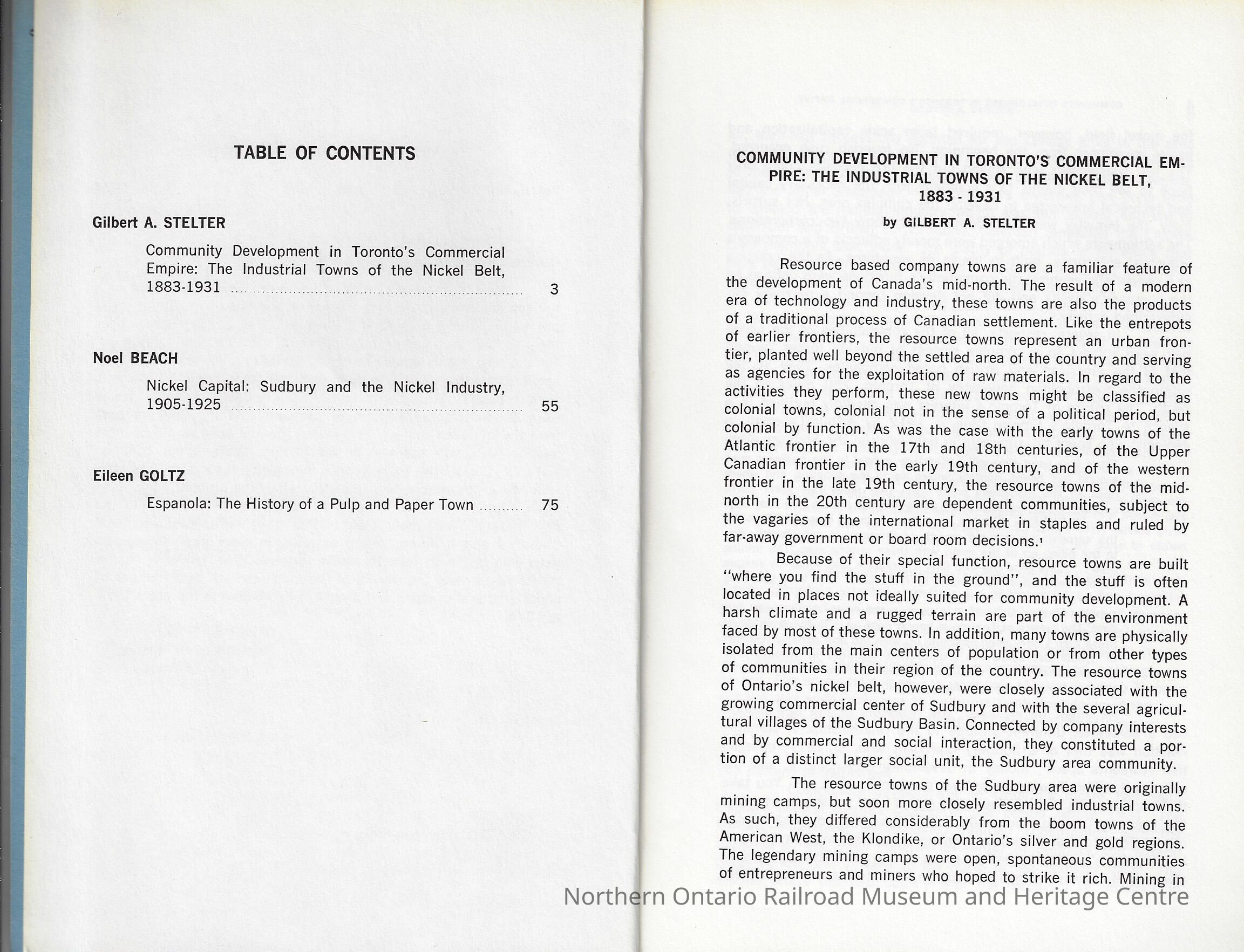 1. "Community Development in Toronto's Commercial Empire: The Industrial Towns of the Nickel Belt, 1883-1931" by Gilbert A. Stelter