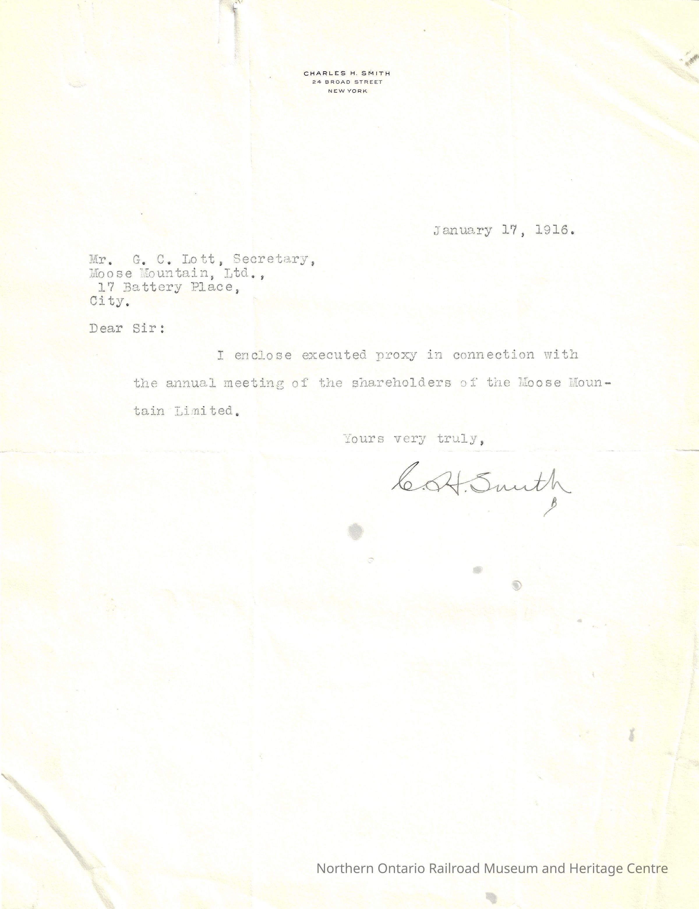 Letter, C.H. Smith to G.C. Lott, Moose Mountain Limited. January 17th, 1916Entry/Object ID