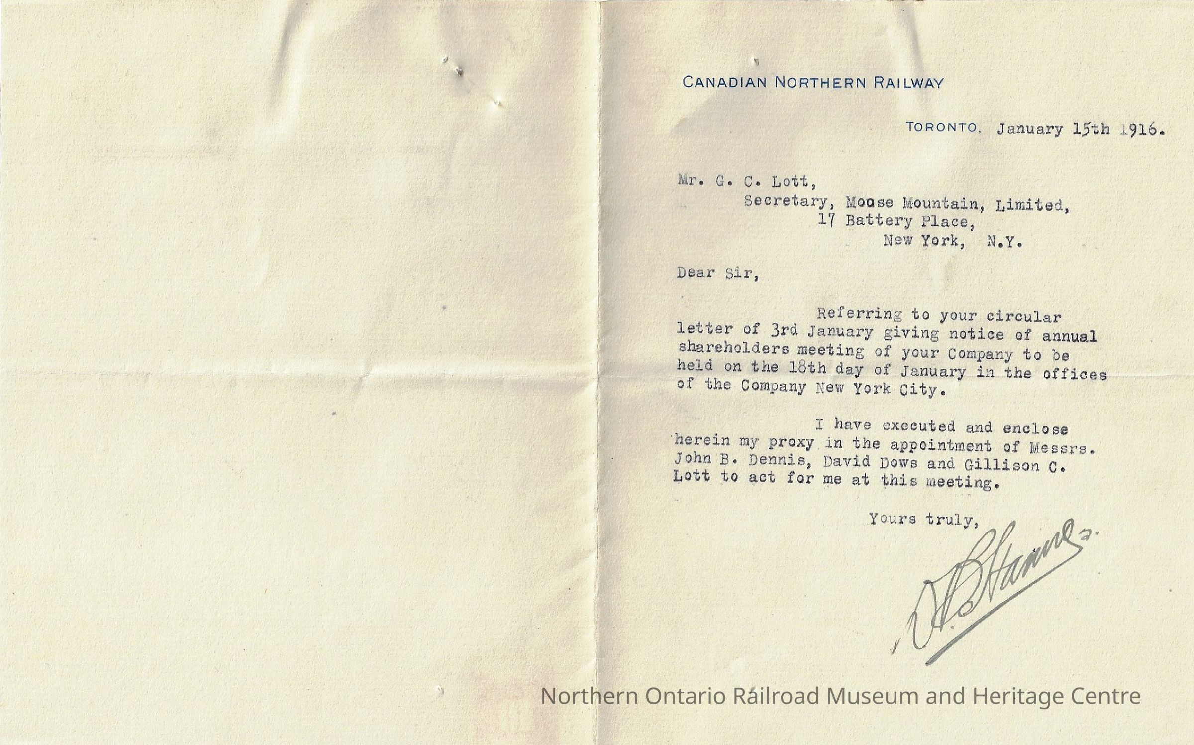 A letter from the Canadian Northern Railway to Mr. G.C. Loot, Secretary, Moose Mountain Limited, New York, N.Y. U.S.A regarding the annual shareholders meeting of Moose Mountain Ltd. Sent January 15th, 1916Collection